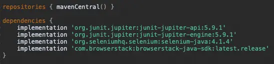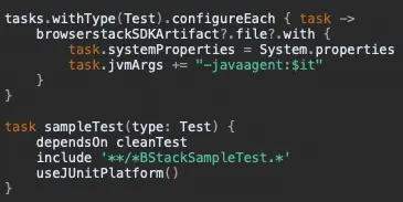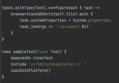 In the same build.gradle file, modify the gradle tasks to add jvmArgs which include browserstackSDK as a javaagent