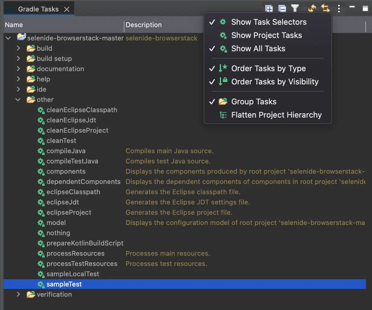 Click the Gradle tool window on the right-hand side. If you can’t see the tool window, click Window > Show View > Gradle Tasks to enable it