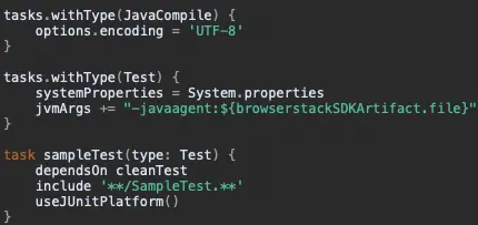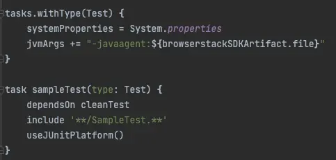 In the same build.gradle file, modify the gradle tasks to add jvmArgs which include browserstackSDK as a javaagent