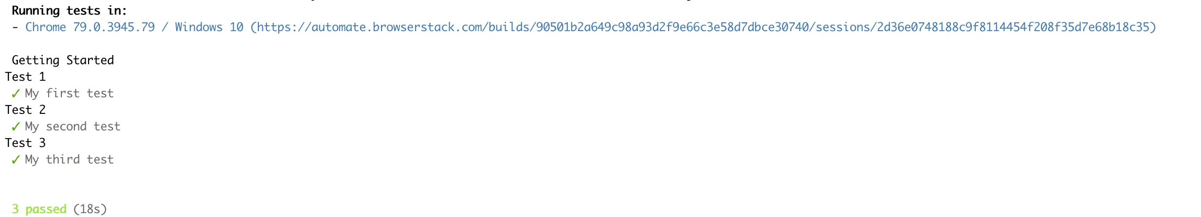 The preceding command executes each of the test function of test.js as a separate session on BrowserStack specified environment.