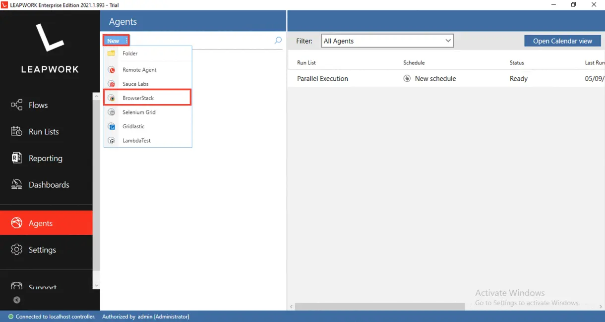 Step 2. In Agents window, click NEW, and then click BrowserStack.