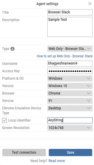 Step 3. In the Agent Settings window, enter the details, such as BrowserStack credentials, and OS-Browser/Device combination that you want to use for running your test. The following list shows the mandatory settings that you must configure.