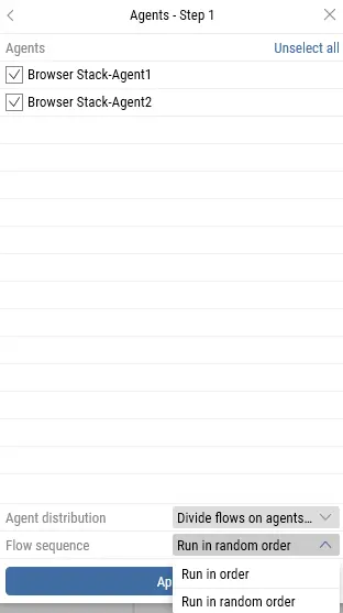 Step 4. In the Flow view, click the Agent Settings selector, and then select the BrowserStack Agent.