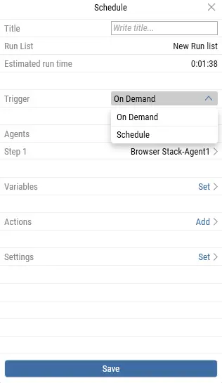 Step 6. Set Trigger to on-demand or Schedule as per your requirement. These run types define the execution schedule for the tests.