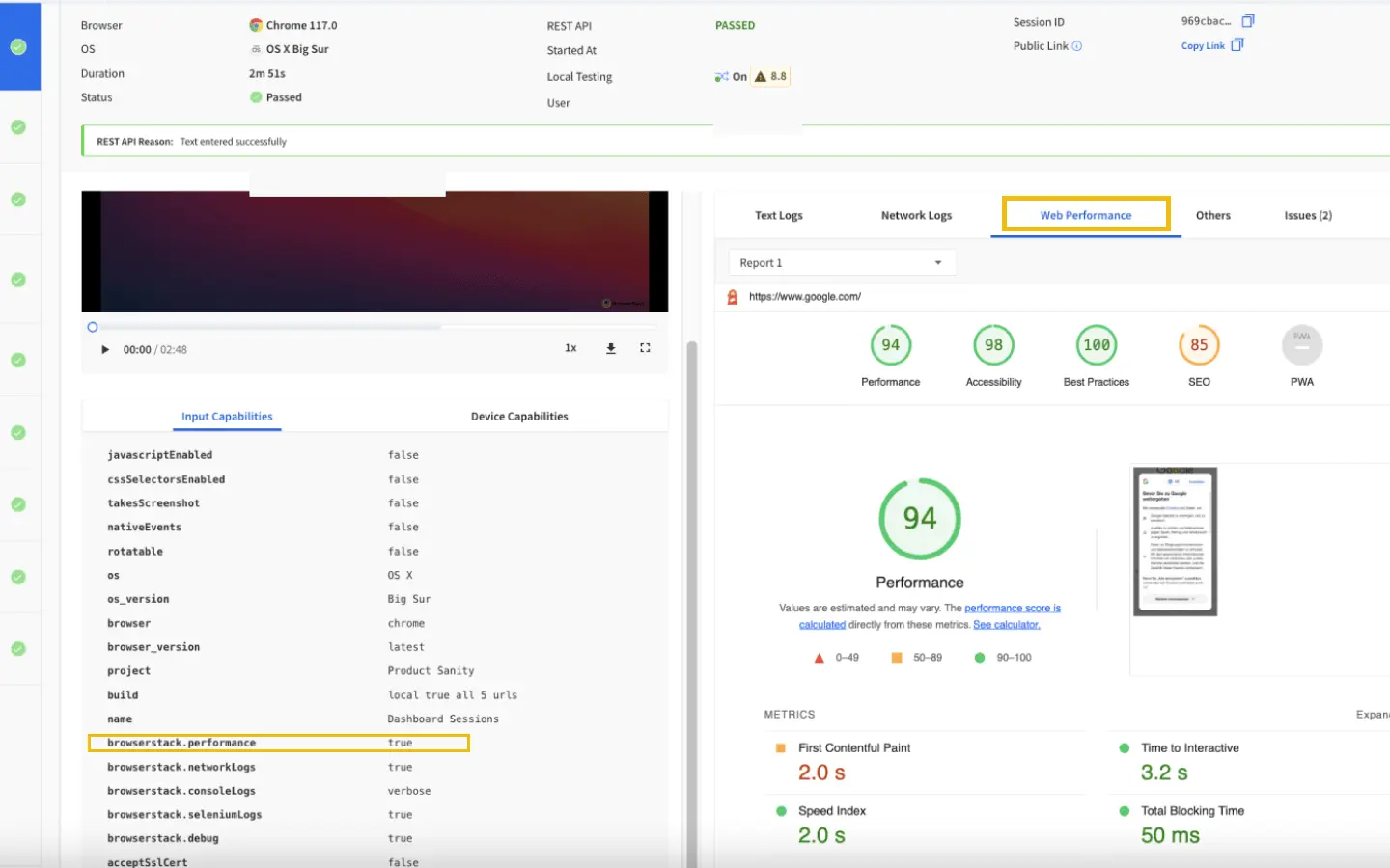 falseby default. You can see the Web Performance tab on the Automate dashboard only when you set the capability totrue. - If a pop-up appears on the web page of your website under test when Lighthouse launches, the report does not get generated.