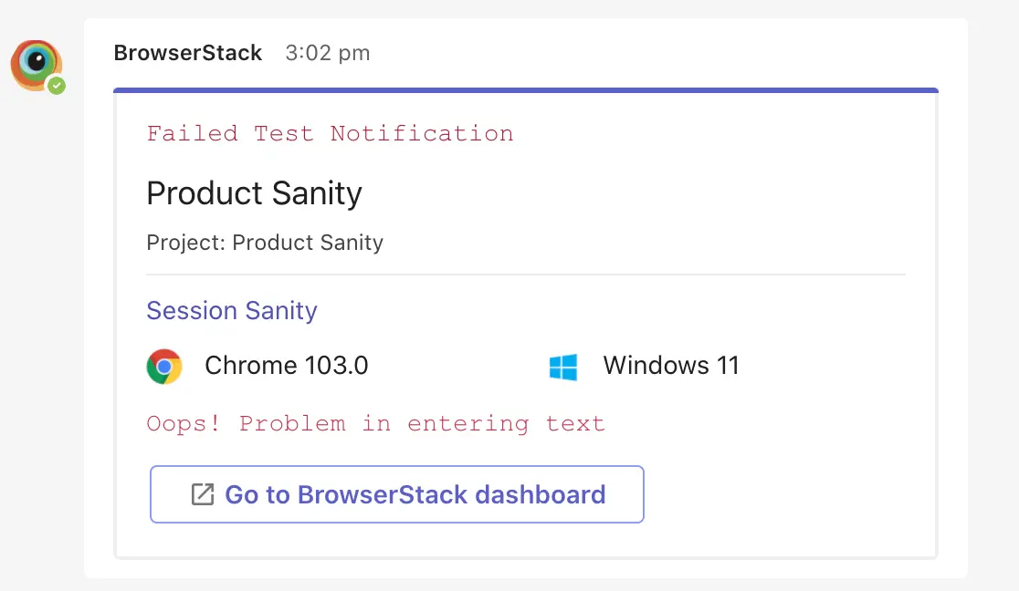 BrowserStack for Microsoft teams encourages you to remain updated with test execution status as it occurs on the Automate dashboard. It also lets you subscribe and receive a daily test summary in your chat and analyze the health of your test suite.