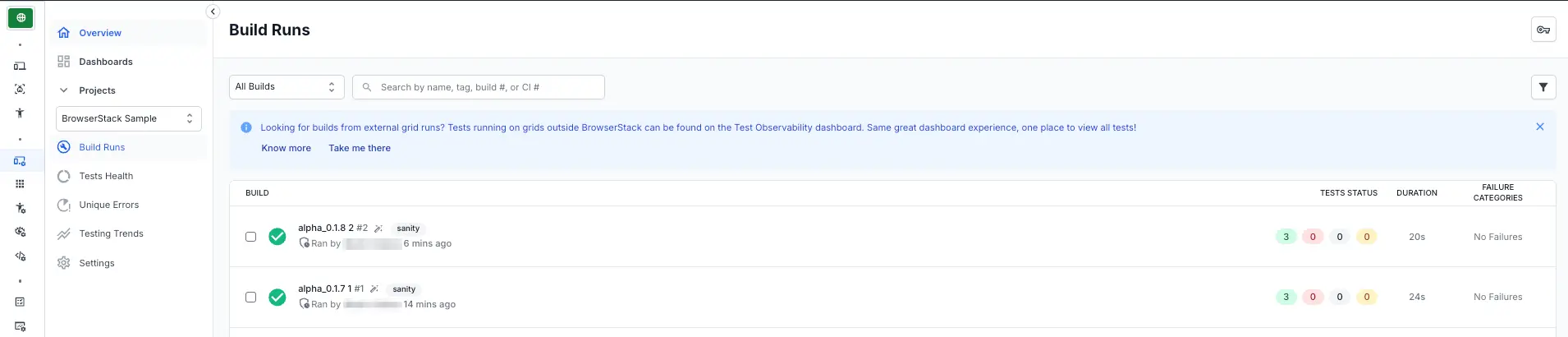 When you run the next test, simply change the build name, and it will be grouped into the same build and project. Similarly, you can update the build tag - the most recent build tag will replace any previous tags you may have provided and add a new tag if one did not previously exist.