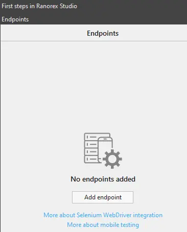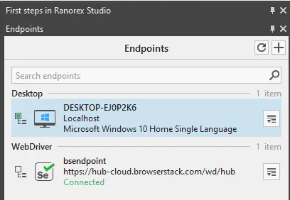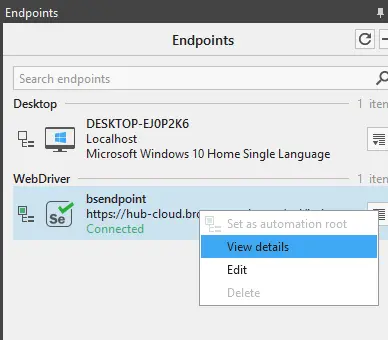 To execute Ranorex test on BrowserStack you need to add a new configuration to set up the BrowserStack desired capabilities, this can be achieved by selecting the Endpoints tab, select the View details option from the endpoint that you added.
