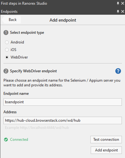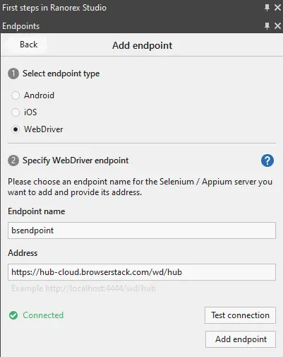 Select WebDriver in Select endpoint type section, provide an Endpoint name and Address(Hub URL). You can check your connection by clicking on Test connection. Click on Add endpoint as shown in the below figure: