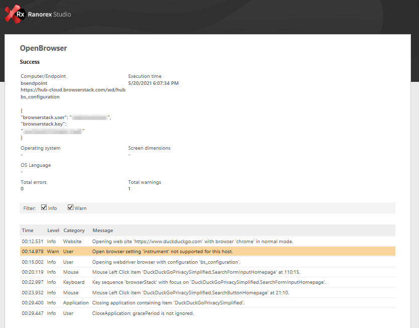 You will find that the test executes with specific configurations on the BrowserStack Automate dashboard, and a Ranorex report will be generated based on the test execution status as shown below:
