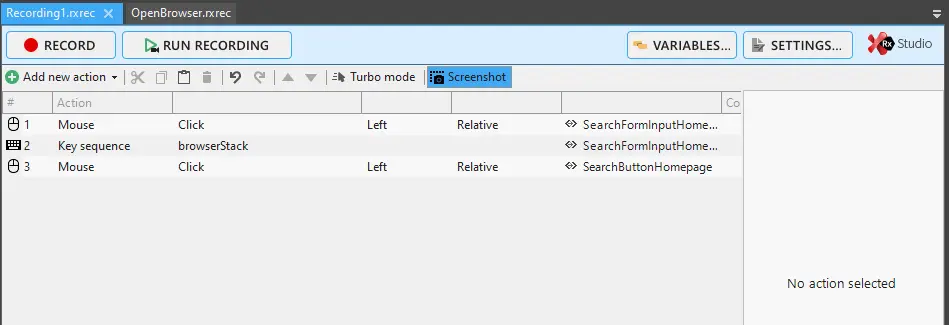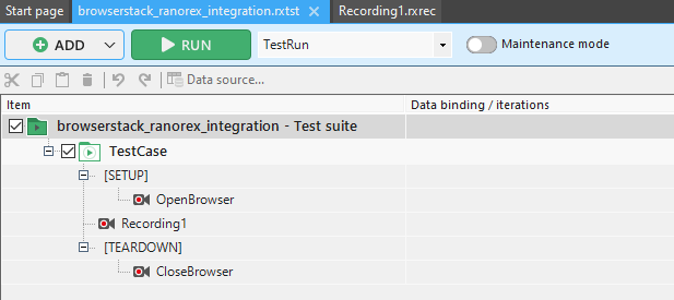 After successfully creating a solution, you will notice that a default test suite would be configured in Ranorex. The test suite has three files OpenBrowser, which contains step to open the browser with the URL specified in Step 4 of Getting started with Ranorex section, Recording1, which contains all the steps executed on the URL, and CloseBrowser, containing steps to close the application.