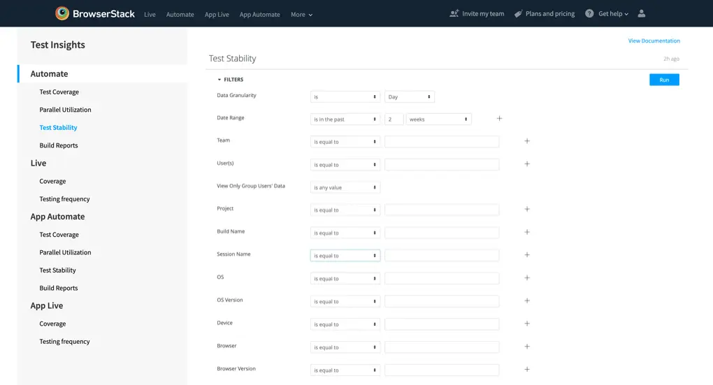 Using the build capability you can utilize BrowserStack Enterprise’s Test Insights feature. Test Insights allows the admin to evaluate the performance of automation testing across the organization. It provides information about the tests that are run by various account users. It also allows to filter analytics by teams, builds, error rates, device and browser coverage to give out meaningful data about your tests as shown in the following figure: