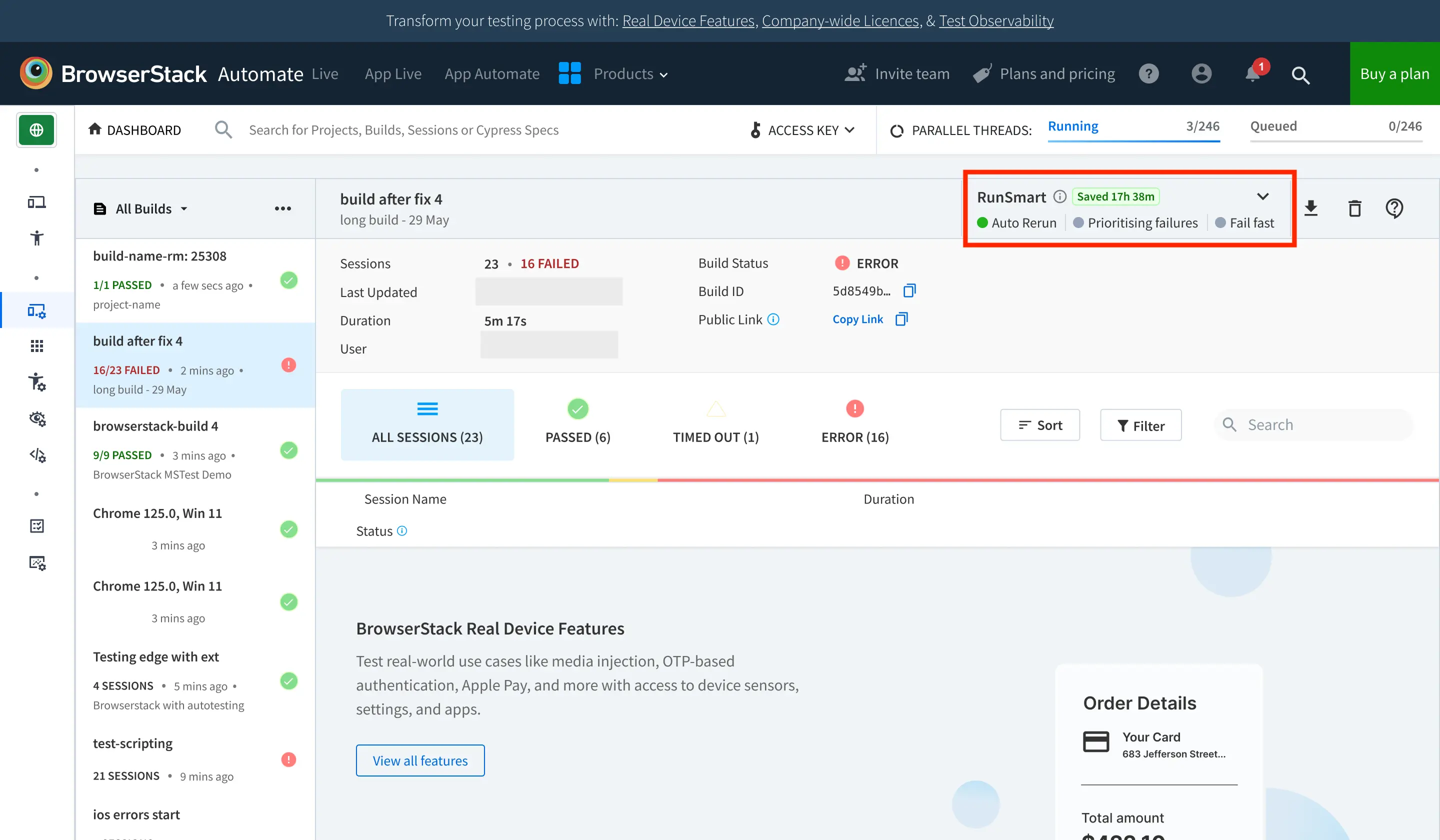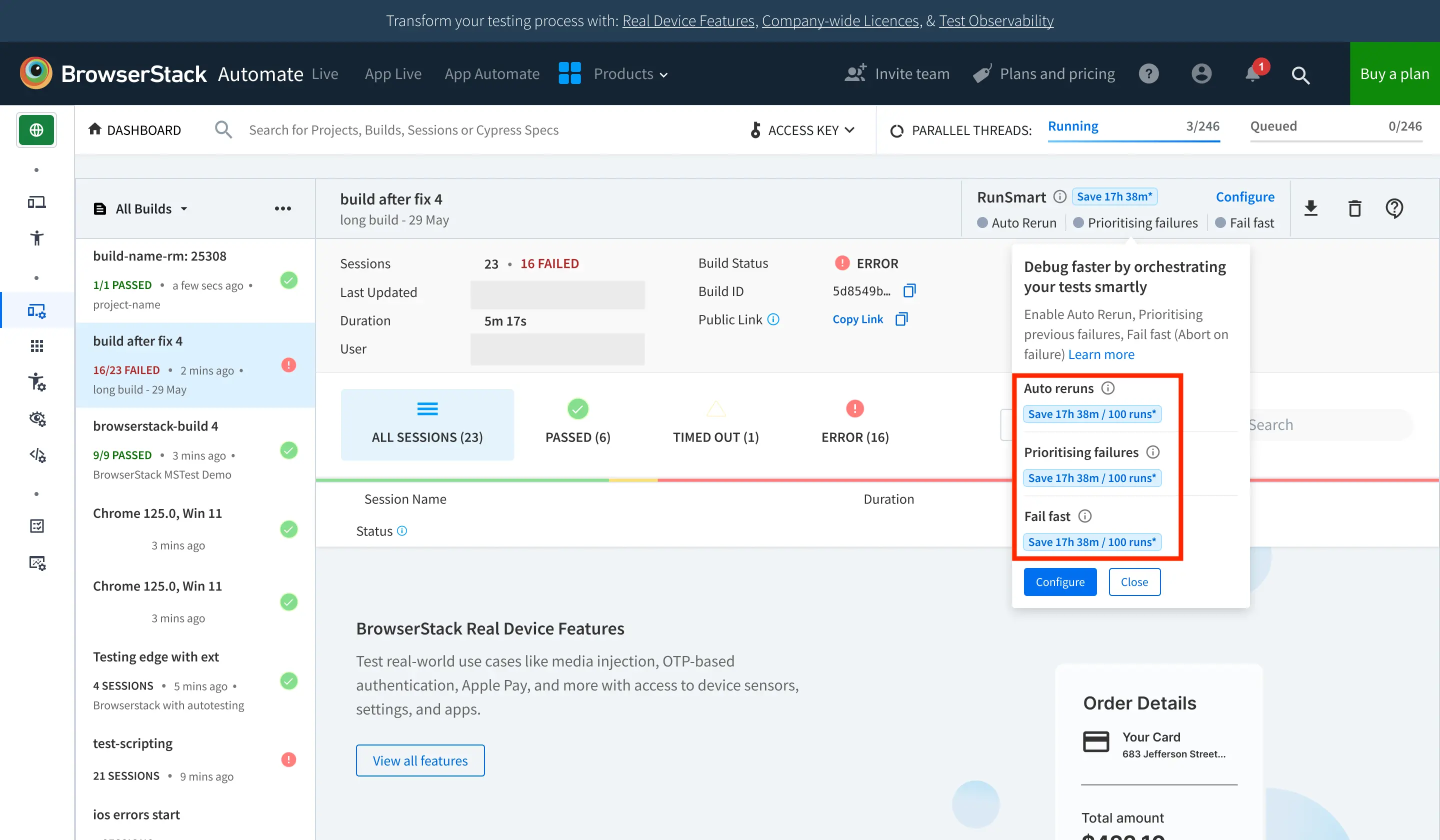 - Reduced infrastructure usage & cost by skipping less relevant tests. The BrowserStack SDK allows you to configure strategies such as auto retries, fail fast, rerun failures only/first, etc., to optimise your test builds.