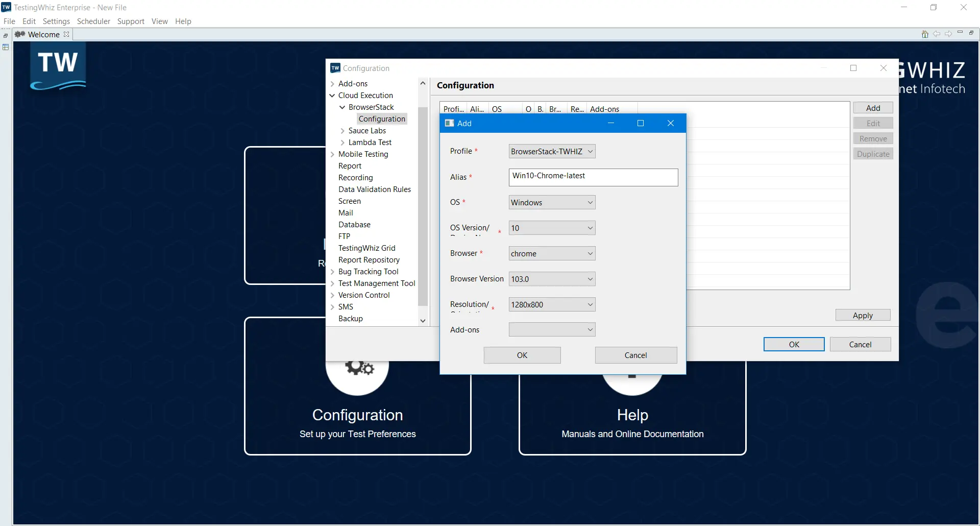 - Click Add to setup a browser configuration profile that will be used to execute the test on BrowserStack.