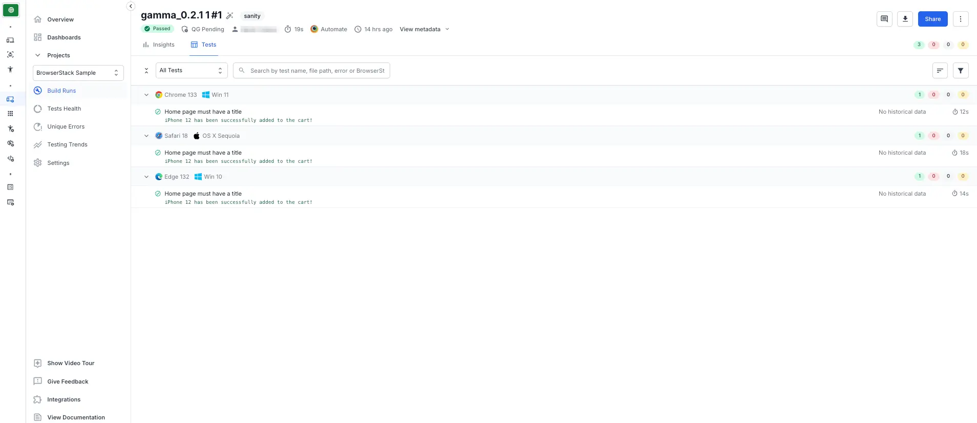 All the test sessions with the same build name are grouped inside the same build on BrowserStack.