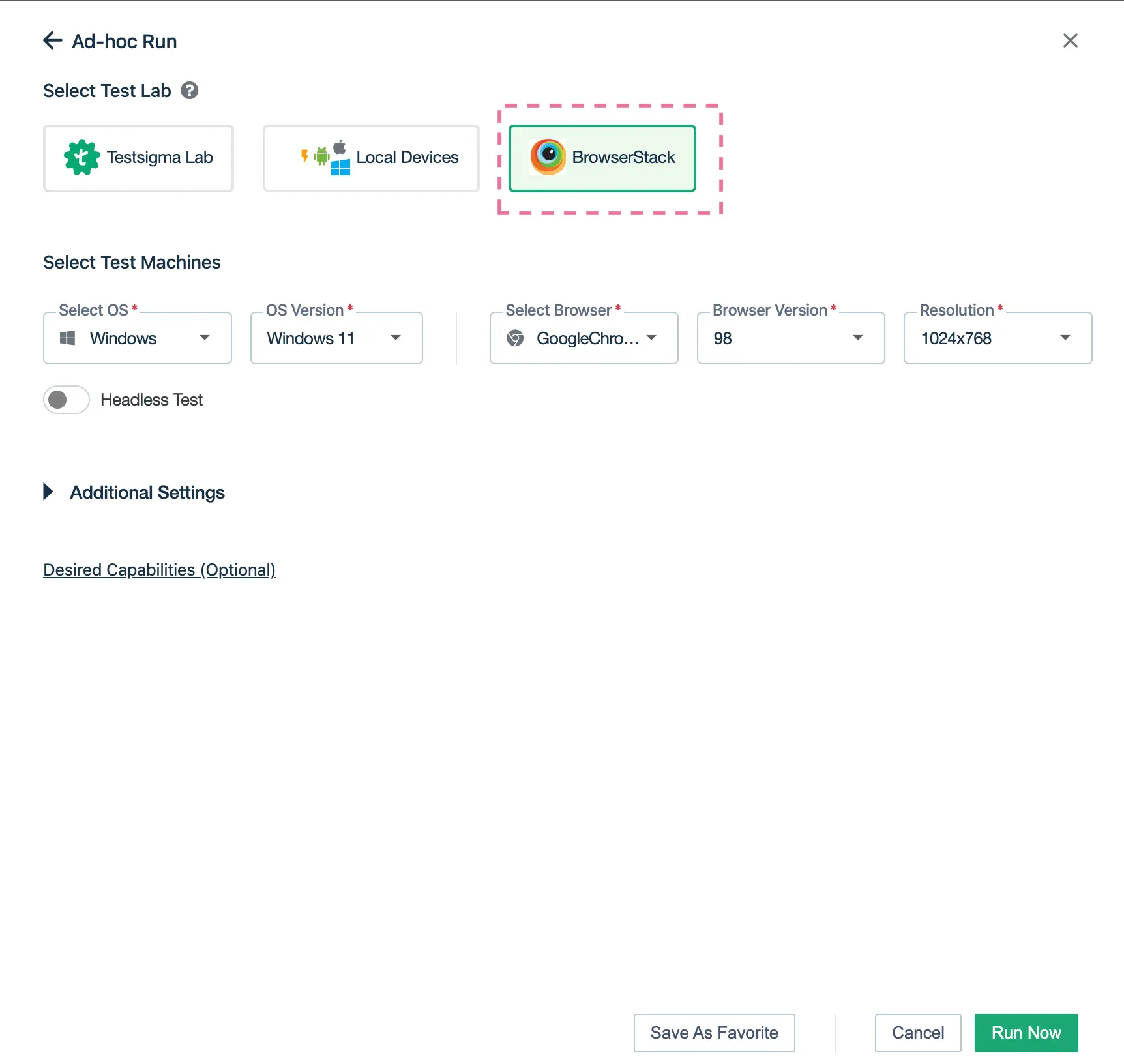 - In the Desired Capabilities section, you can add any additional capability supported by BrowserStack.