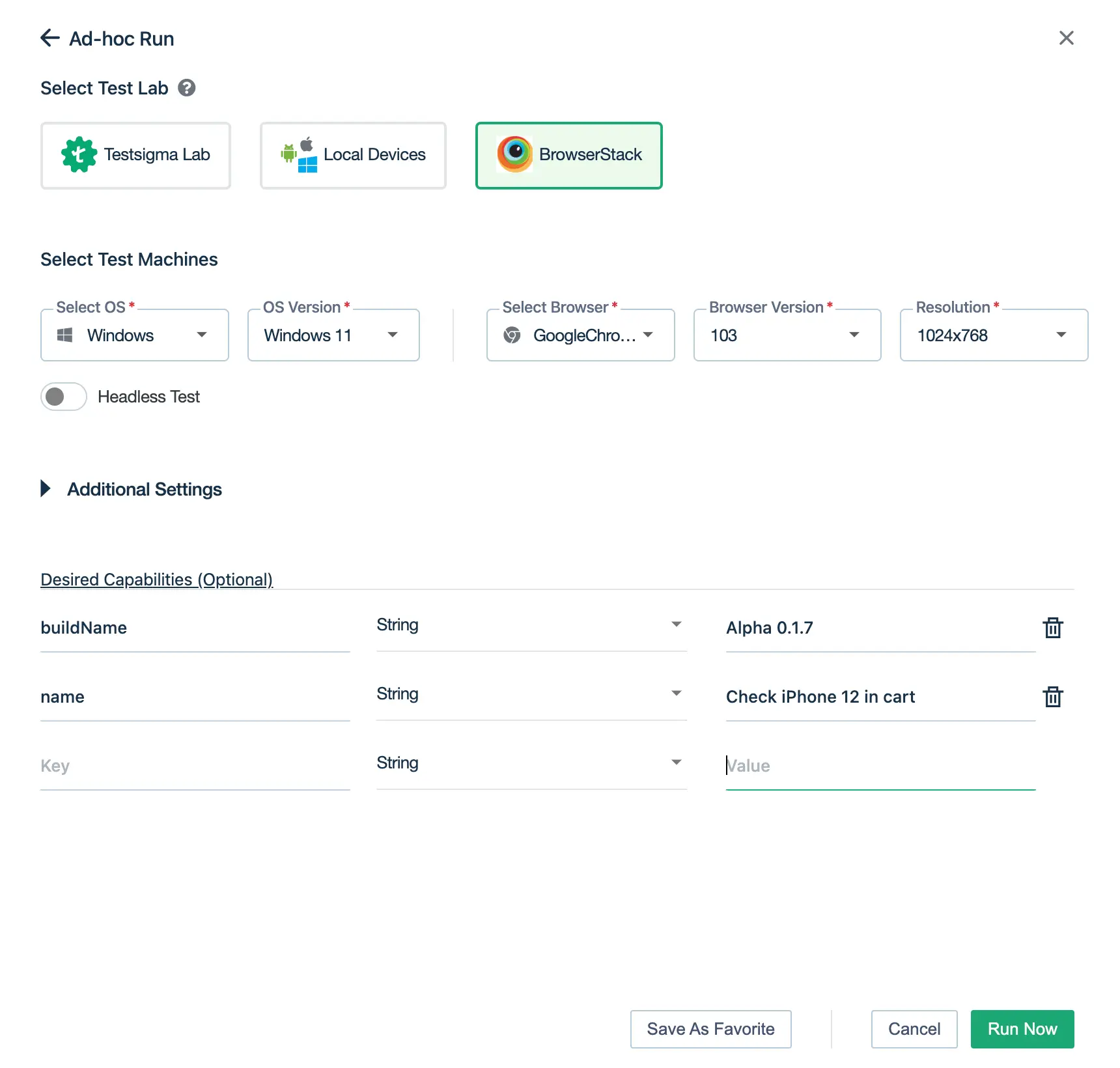 For example, if you are working on your new e-commerce website and want to run your test namedCheck iPhone 12 in cartfor theAlpha 0.1.7build, you can pass the additional capabilities, as shown in the following image: