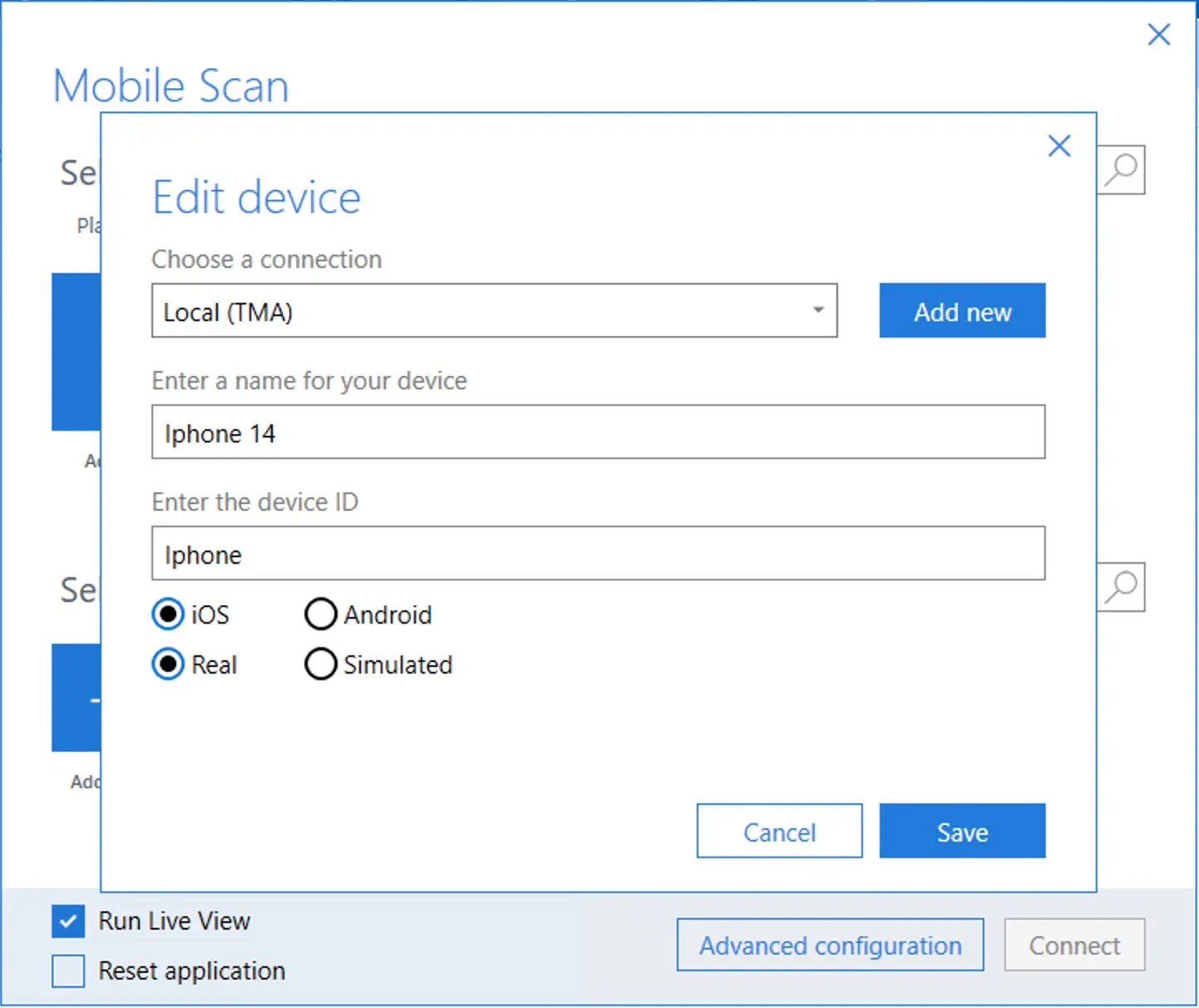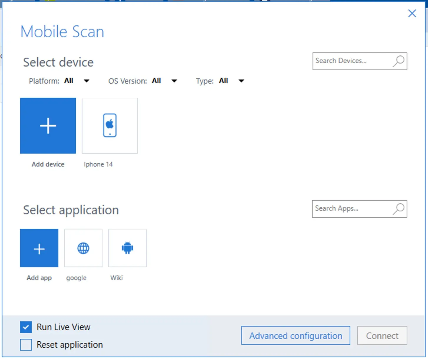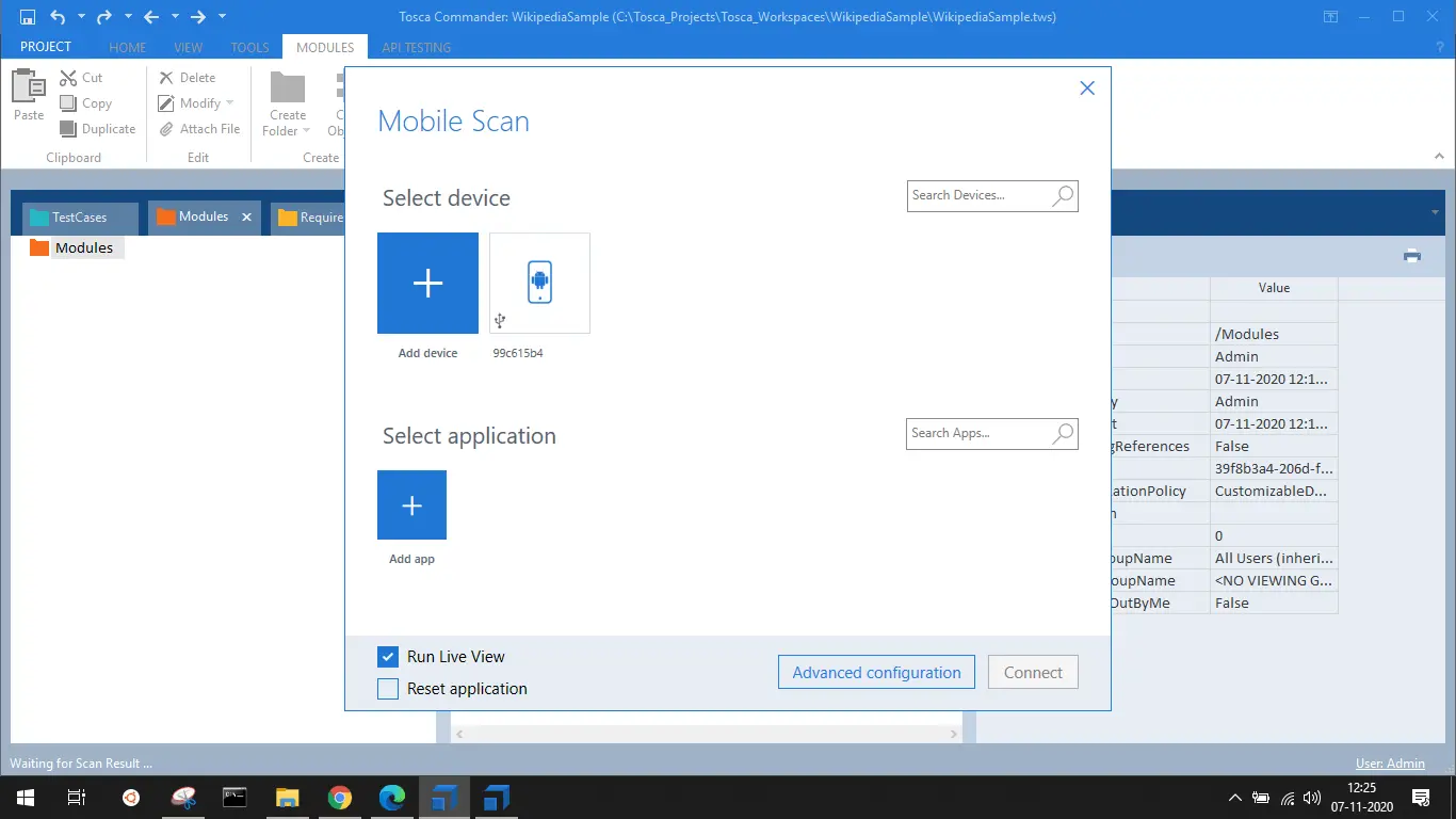Add the device and the app to scan. Please note that you need a valid Tosca license to execute this step.