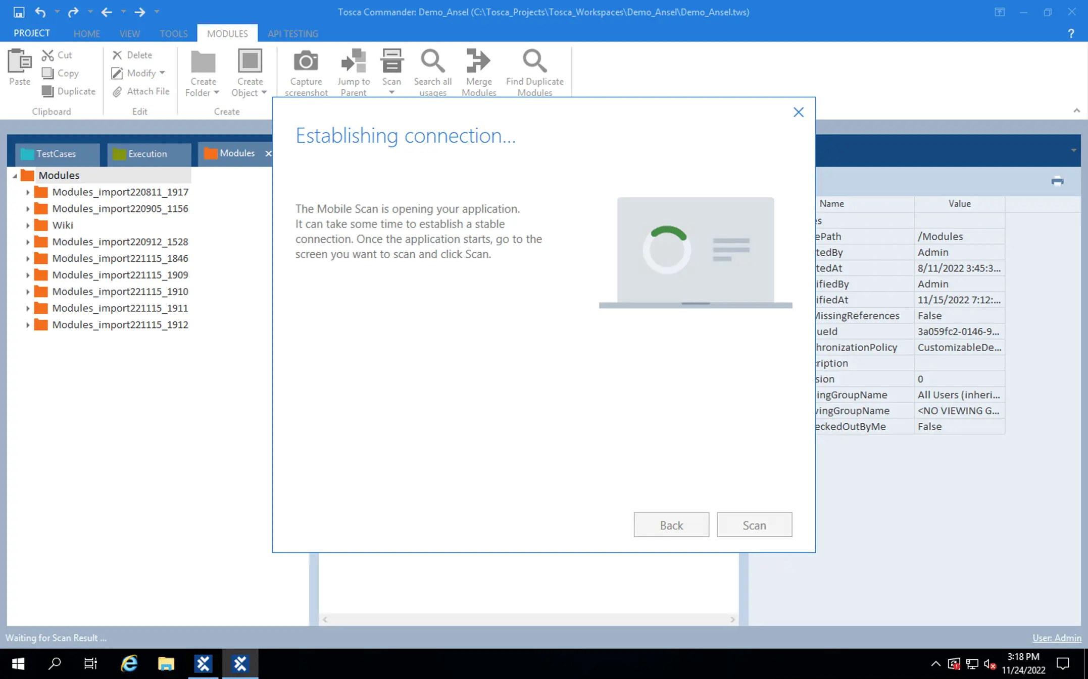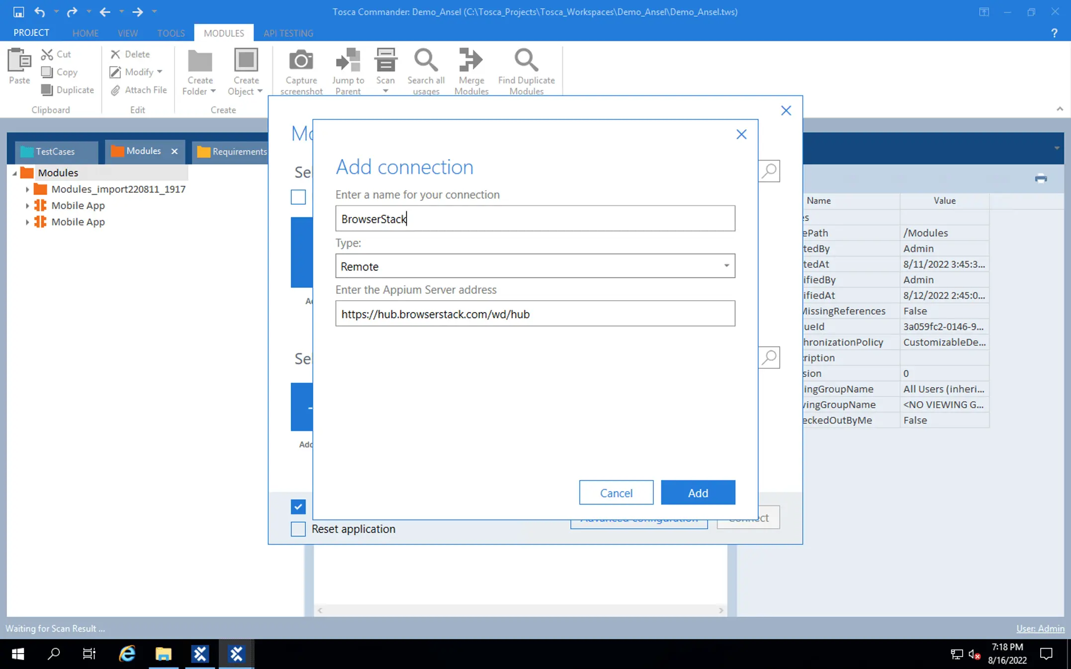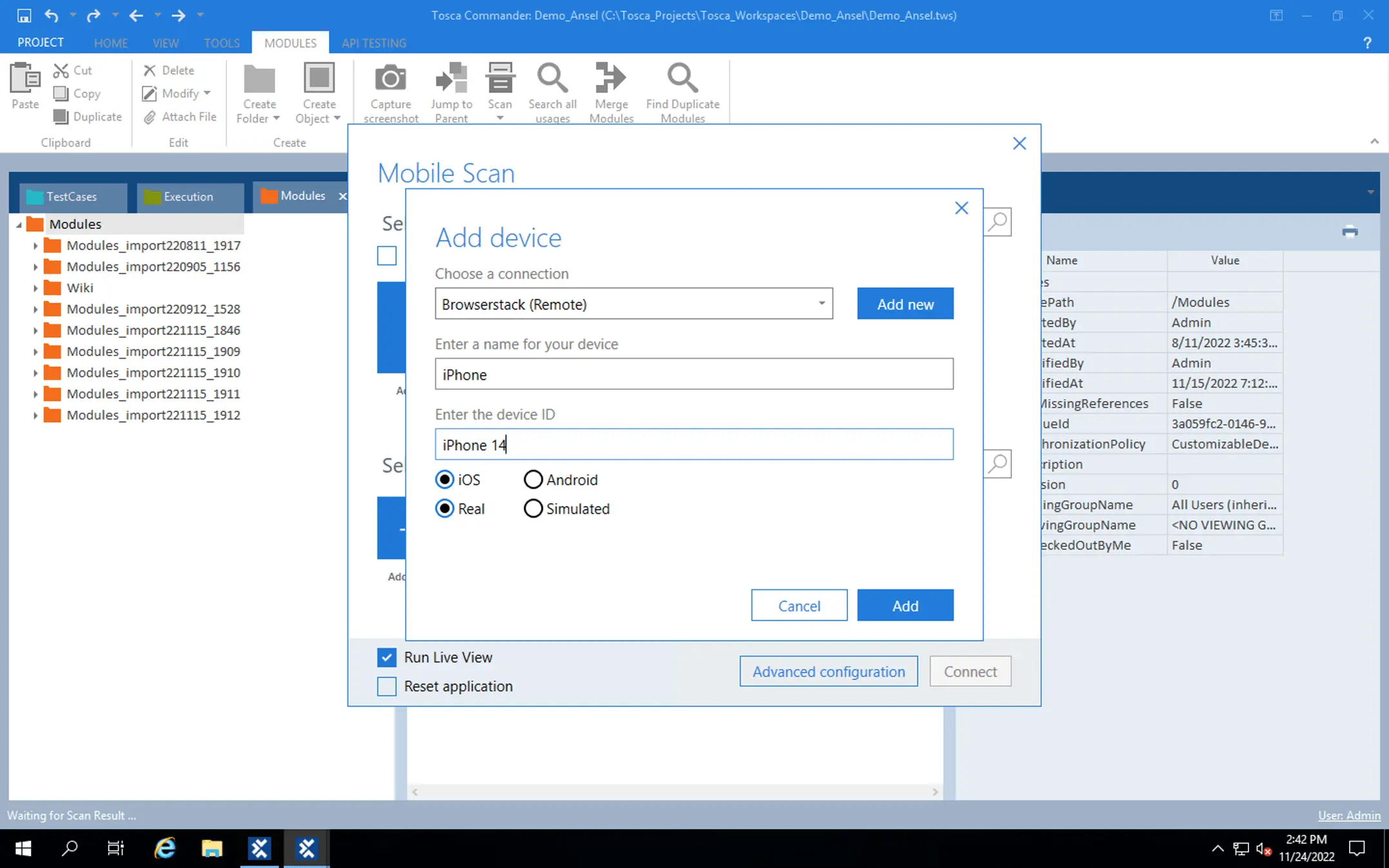 Add the device and the app to scan. Please note that you need a valid Tosca license to execute this step.