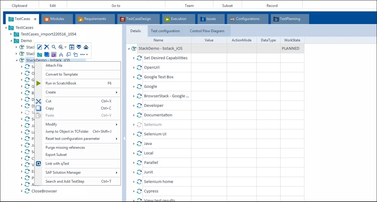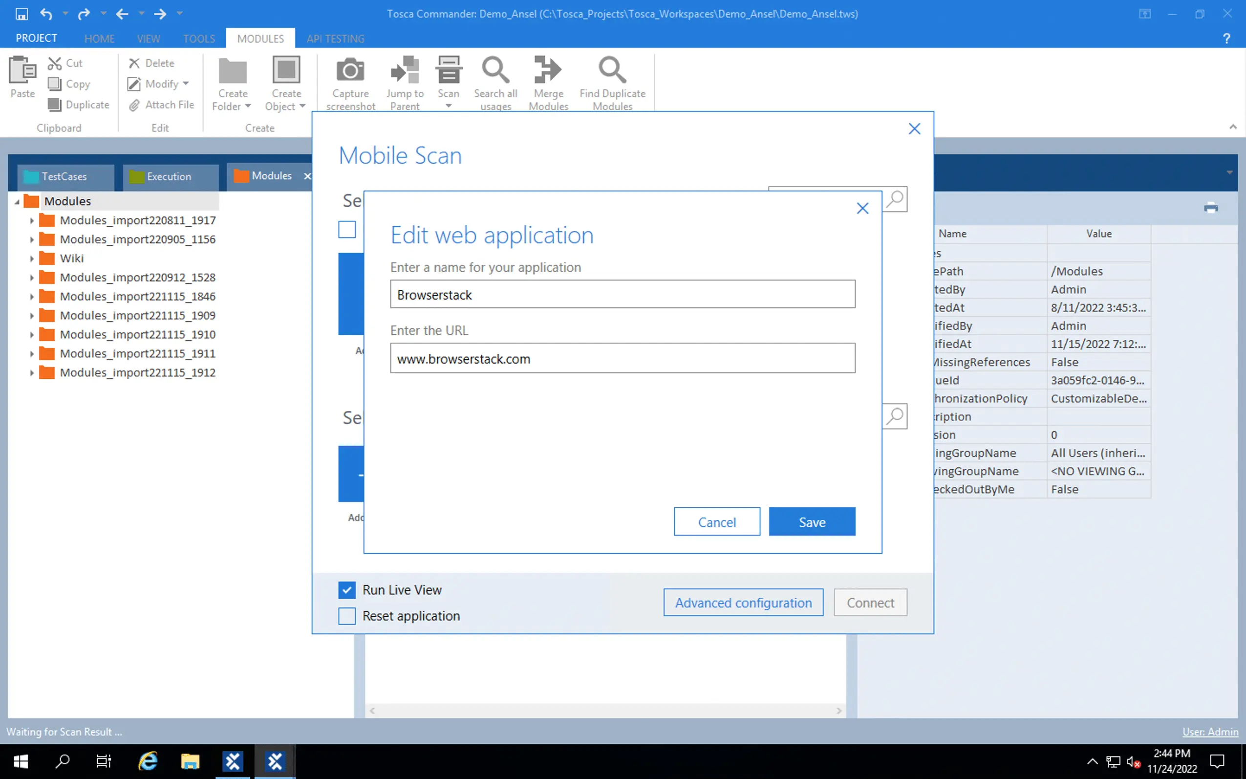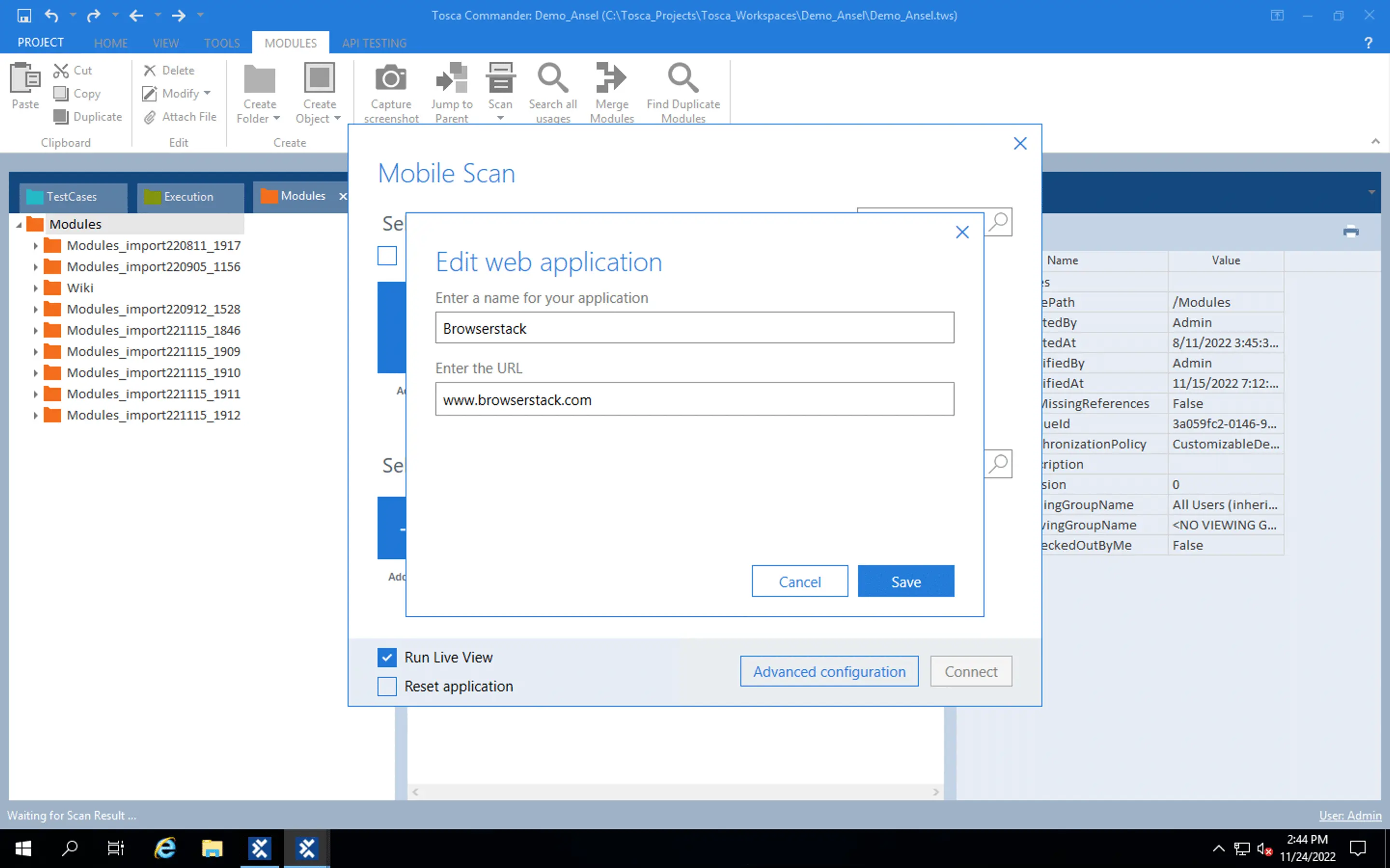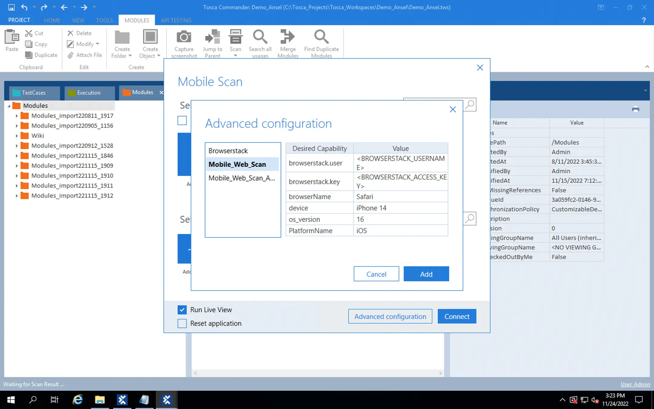 Use Tosca 16 patch 1 or higher to avoid errors in scanning Android mobile browsers. The .conf file is not supported in Tosca 16. Instead, you can add the capabilities using the Tosca Commander mobile scanner. Follow these steps to scan web applications on BrowserStack mobile devices using Tosca: