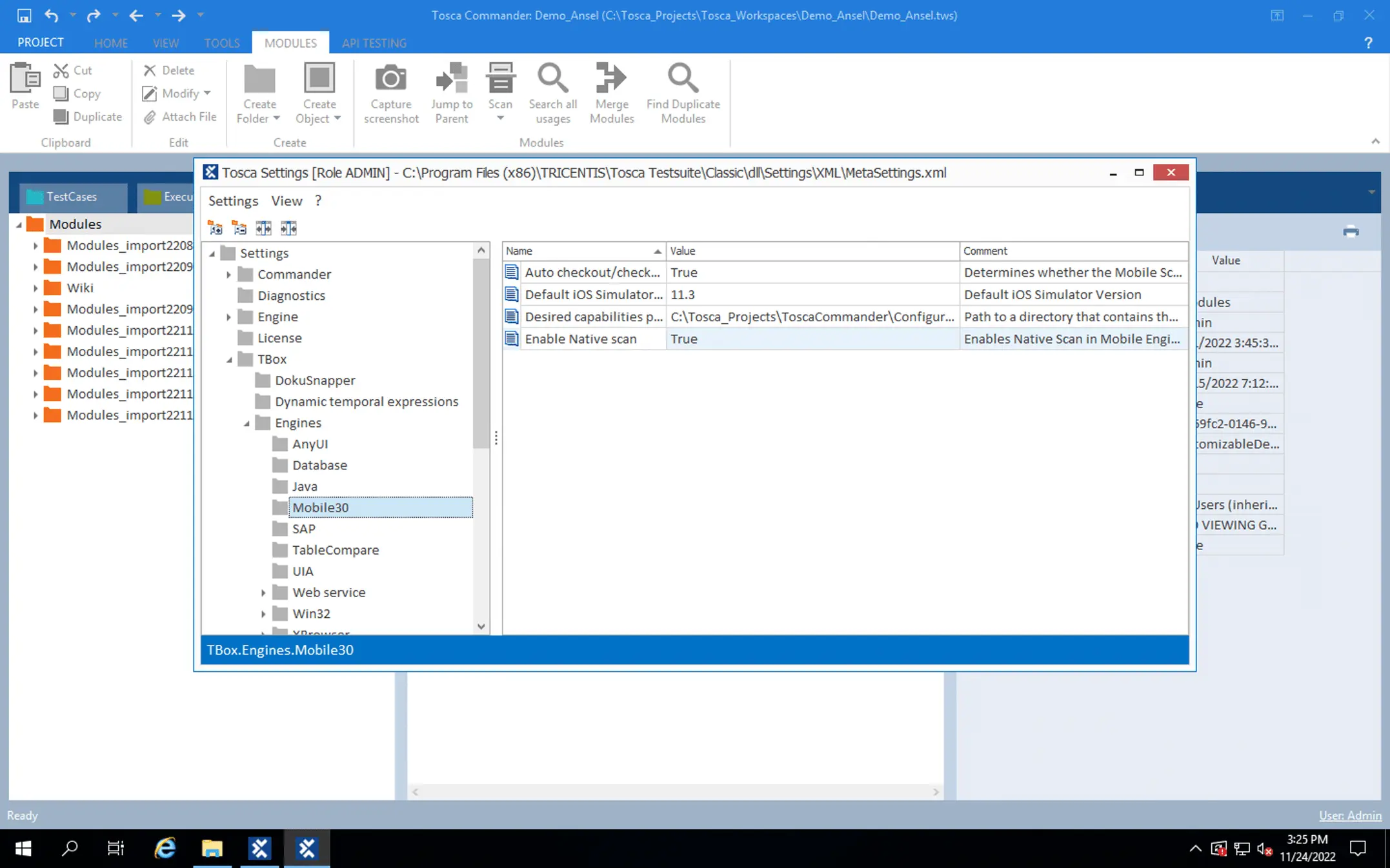 Go to PROJECT > Settings > TBox > Engines > Mobile30 and set the Value field for Desired capabilities as the path of the folder containing the
