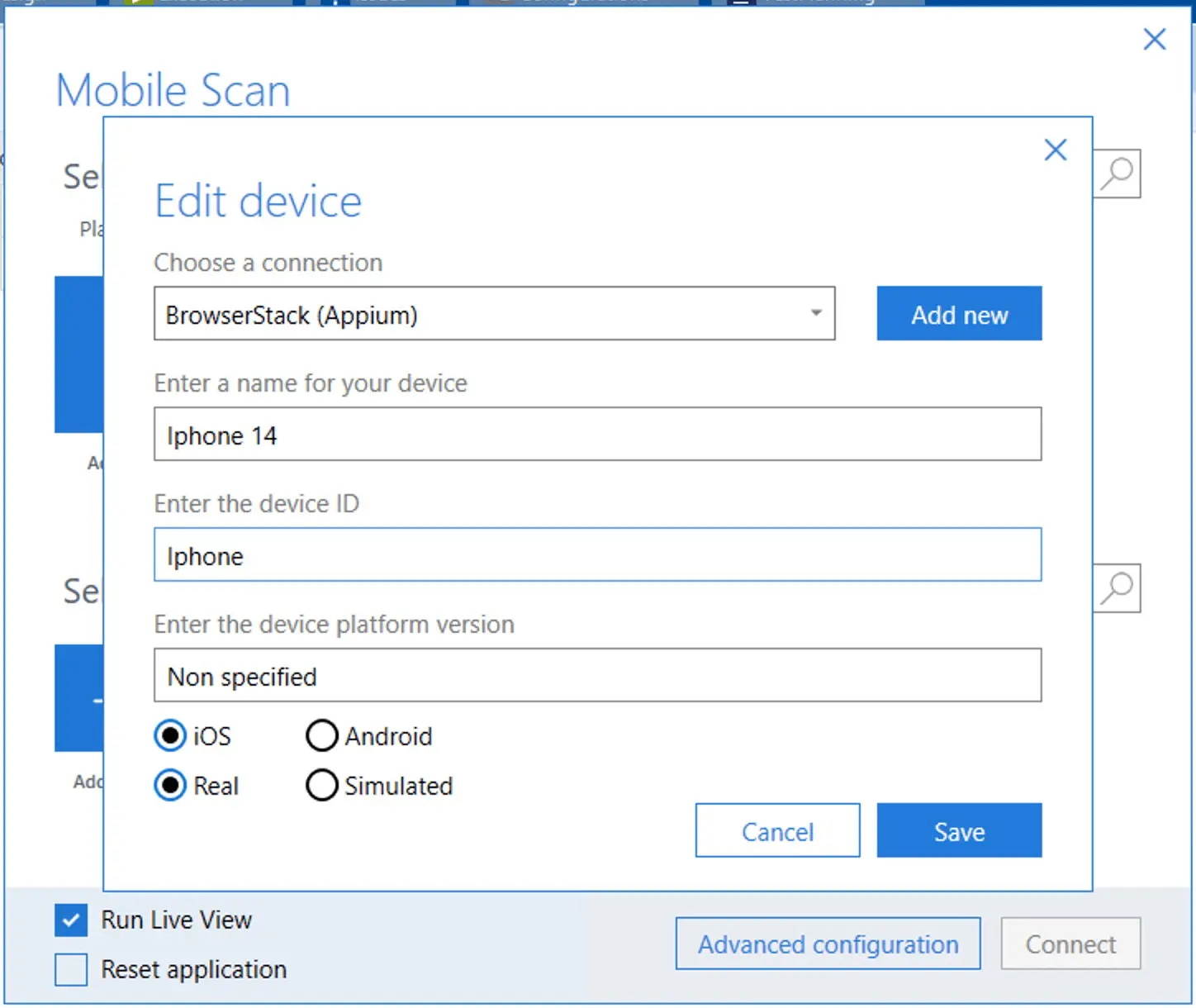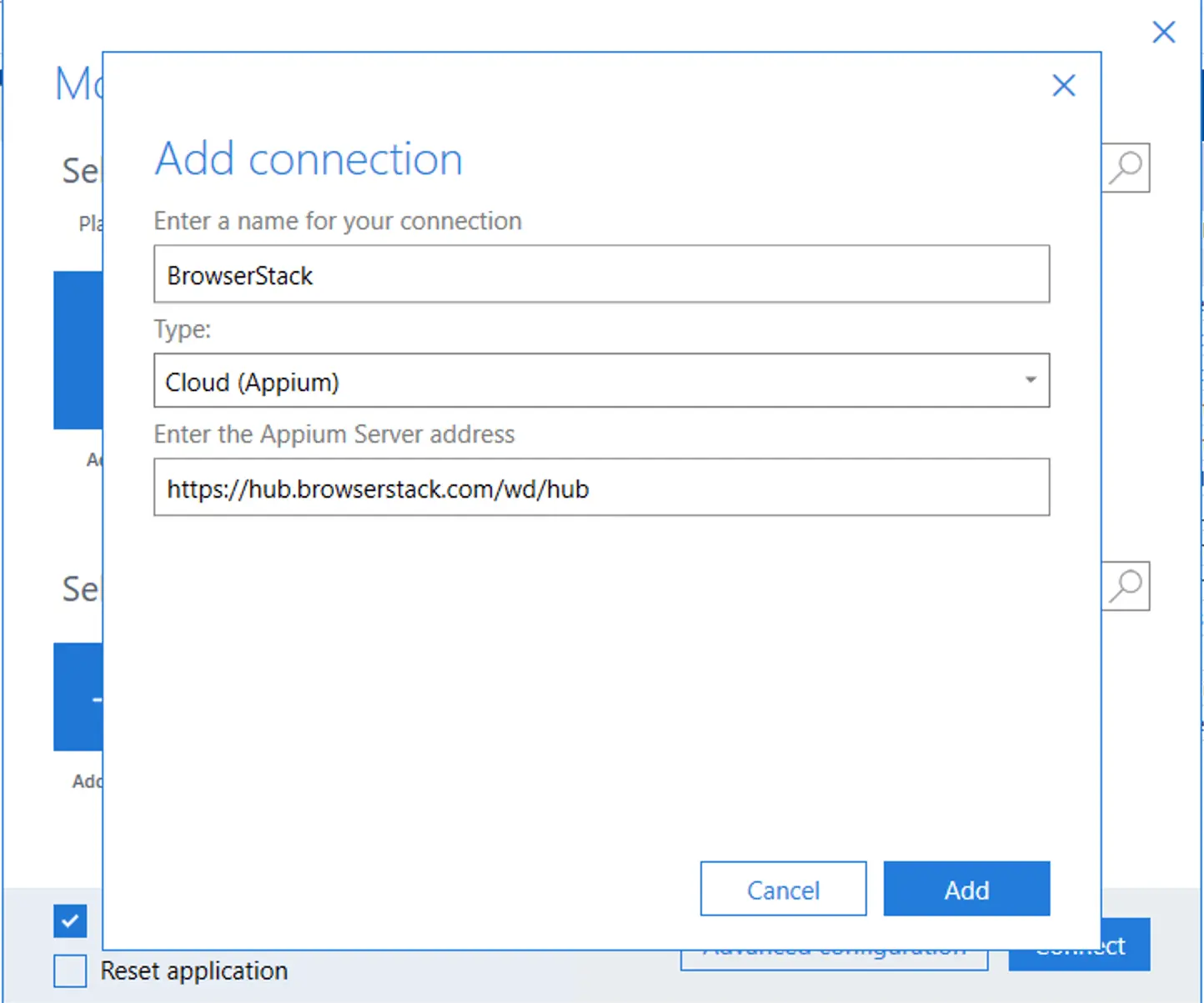 Remotein the field Type andhttps://hub.browserstack.com/wd/hubin the field Appium server address. Click the Add button to add the new connection.