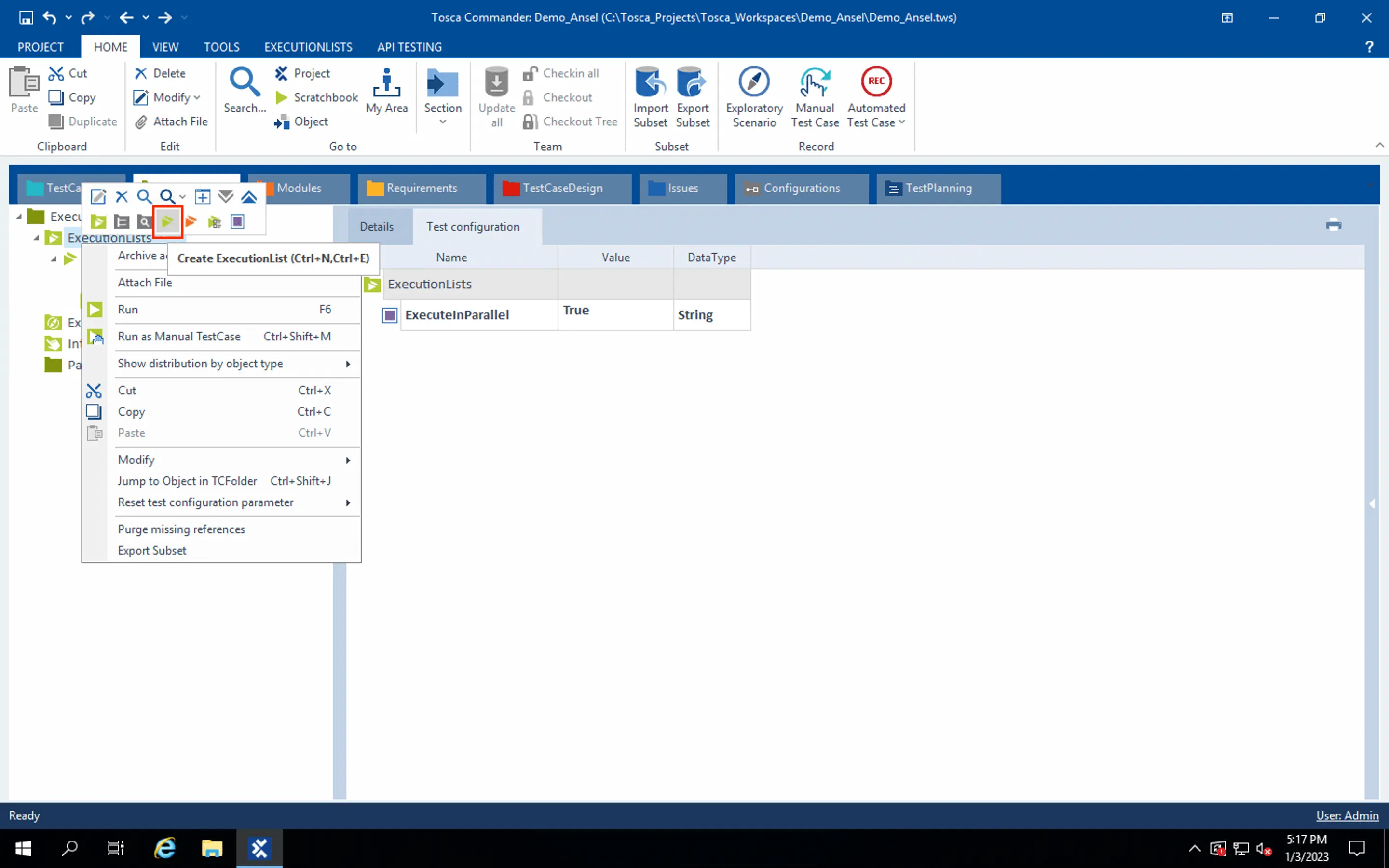 Right-click the ExecutionLists folder and click the highlighted icon to create an Execution List. You can drag and drop the Test cases in the Execution List.