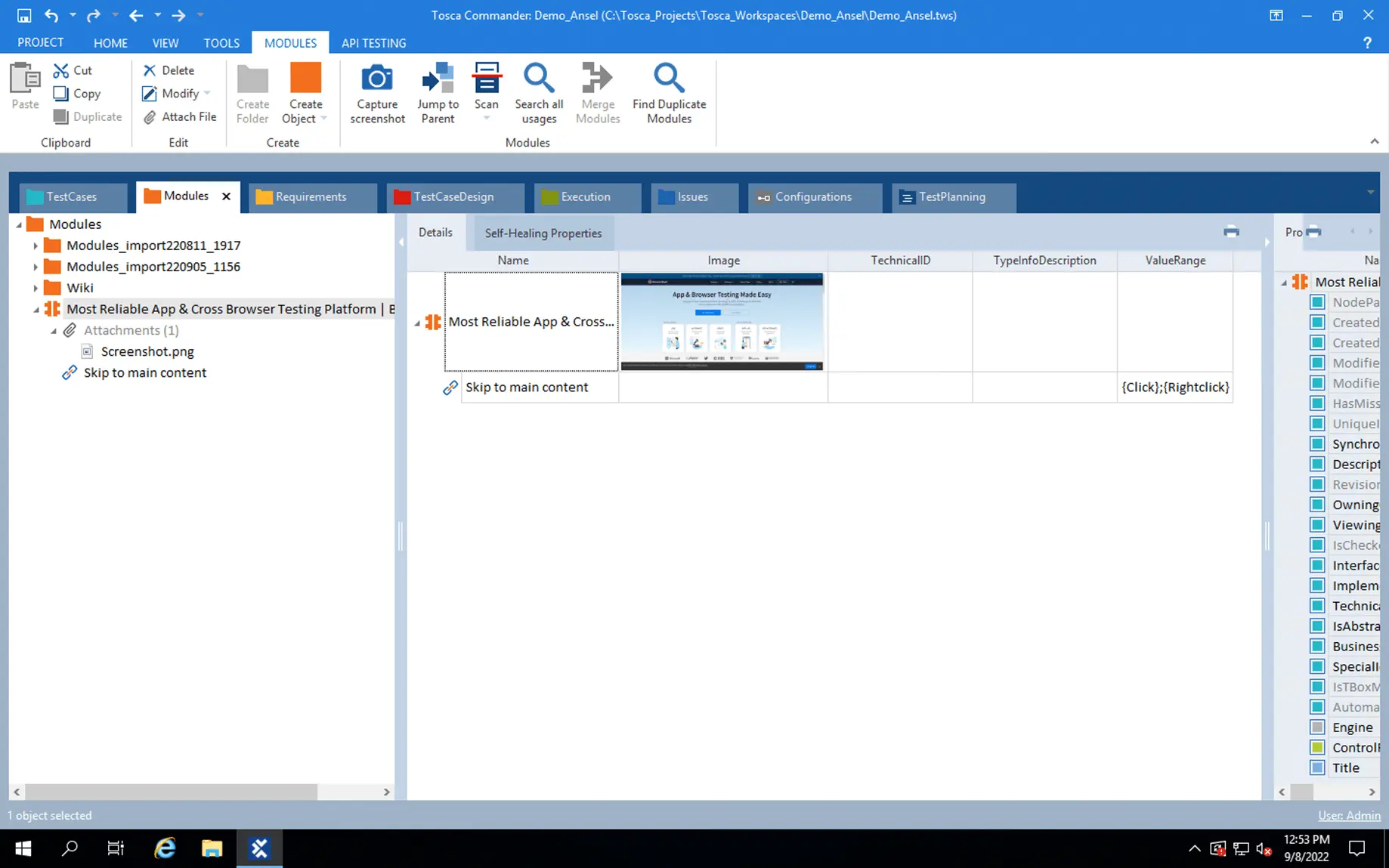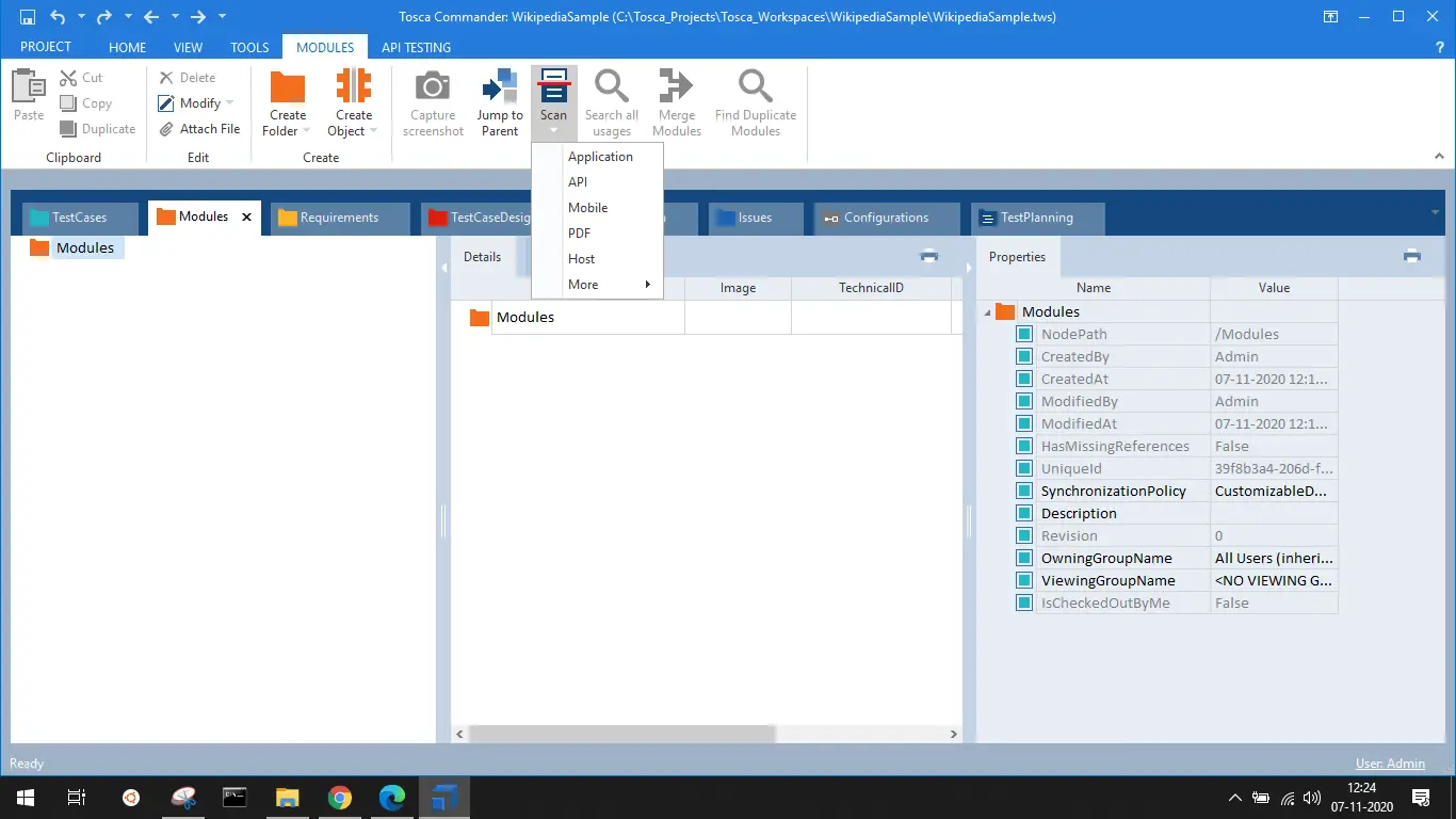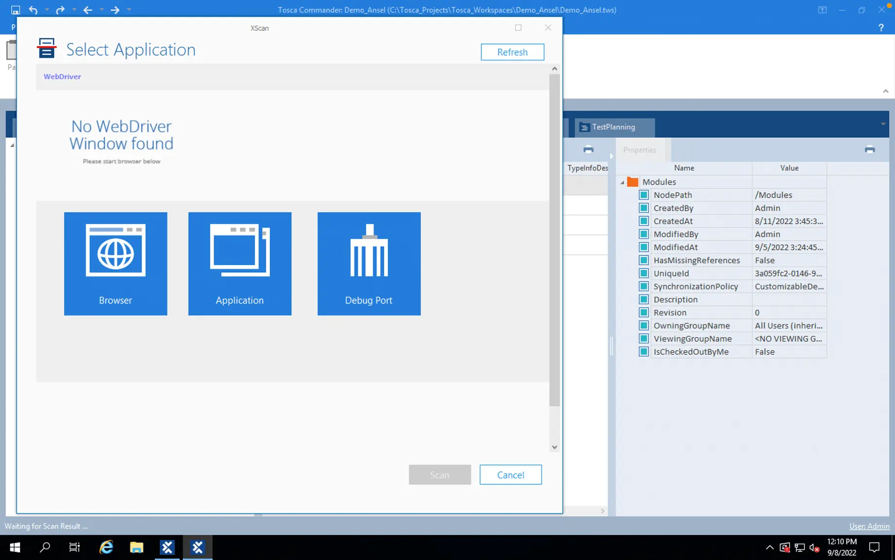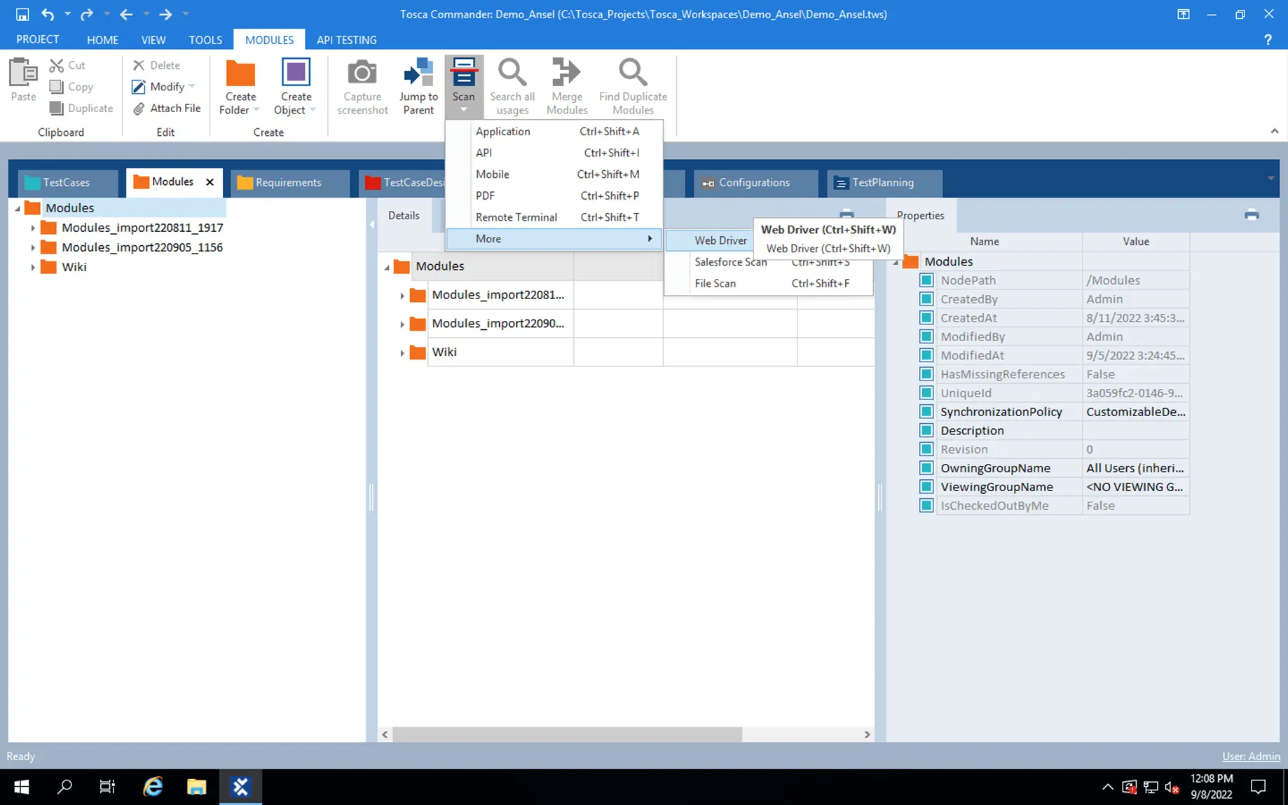 Initiate Tosca XScan to record your actions and create the test steps. Right-click a Module folder or use the dynamic menu Modules and select Scan > More > Web Driver.