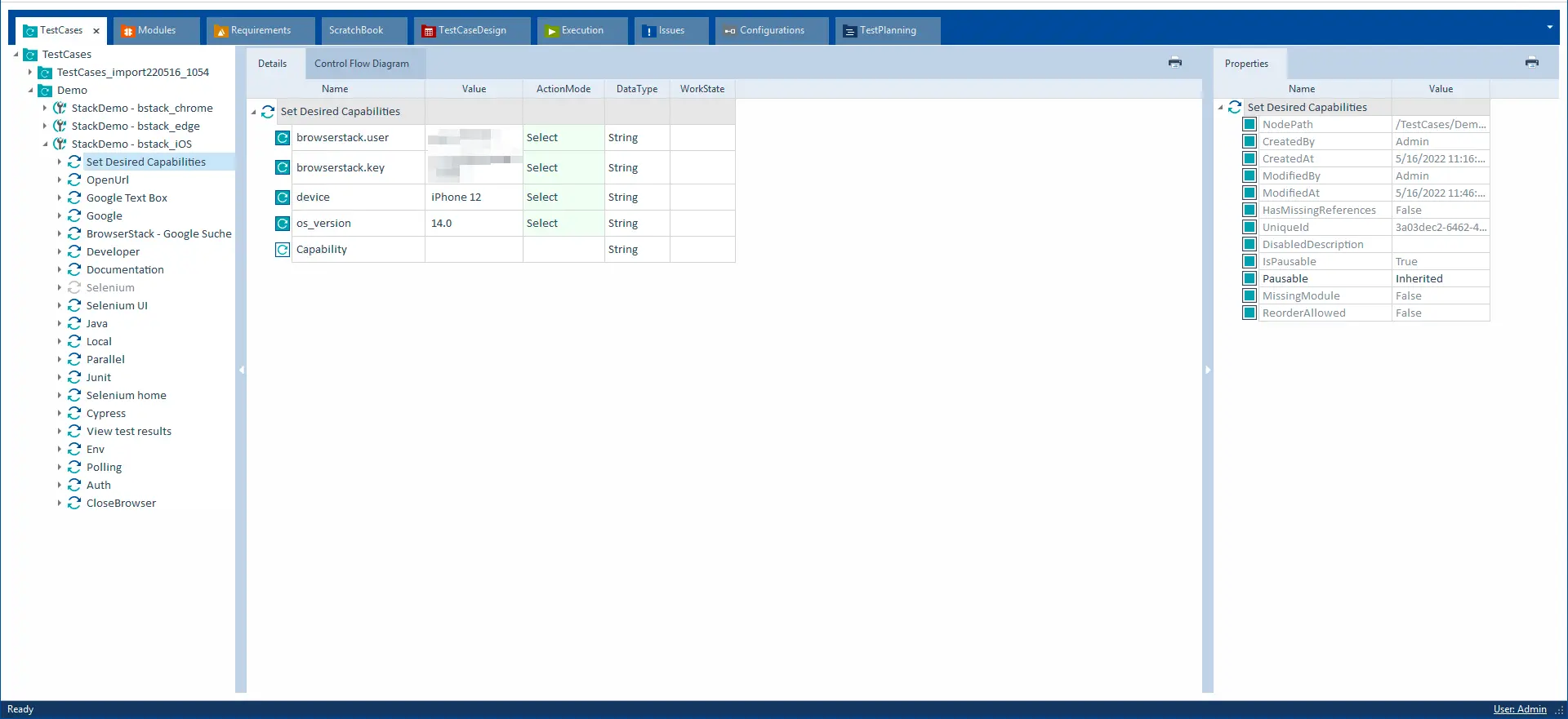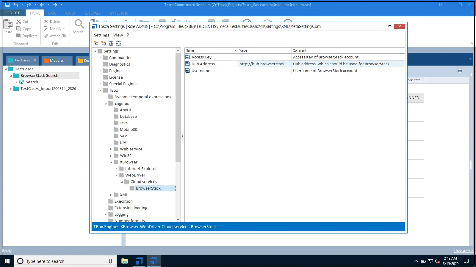 Select your test and update the test configuration details. Select PROJECT > Settings > TBox > Engines > XBrowser > WebDriver > BrowserStack and add your BrowserStack