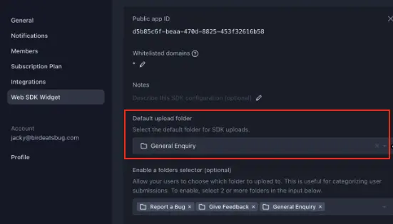 When uploading a bug report from the Web SDK widget, you can pre-select the folder options from the Web SDK Widget settings page. For example, in this image, whenever a user uploads a bug to the “General enquiry” folder, a Slack automation is triggered to alert the support team channels.