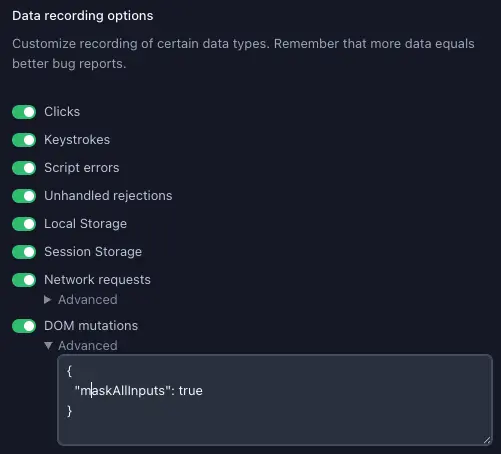 - Expand the Advanced section below the DOM mutations switch in the Data recording options section. Enter a string that can be parsed to a valid JSON object.