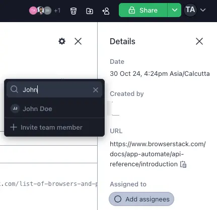 Bug reports can be assigned to multiple team members. Click the Add assignee button in the details panel.