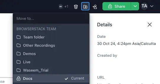 Recordings are stored in specific folders within a workspace. To move a bug report to a different workspace or folder, click the Move button in the top-right and select the destination folder.