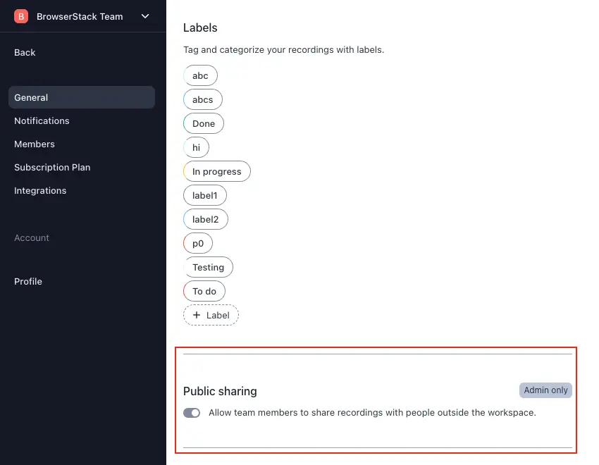 Some organisations may not want to allow the option to share recordings with an open access link for security reasons. A workspace “admin” can disable this sharing option for all workspace members via the General Workspace Settings page.