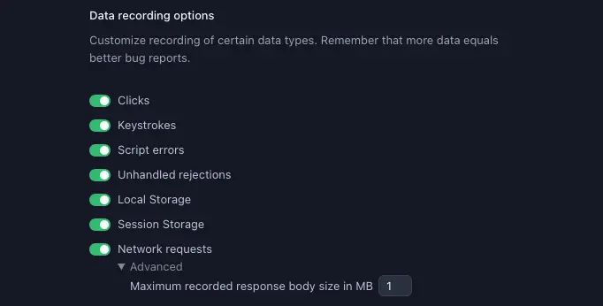 - Expand the Advanced section below the Network requests switch in the Data recording options section, and enter the maximum response body size between 1Mb (the default) and 10Mb (the maximum).