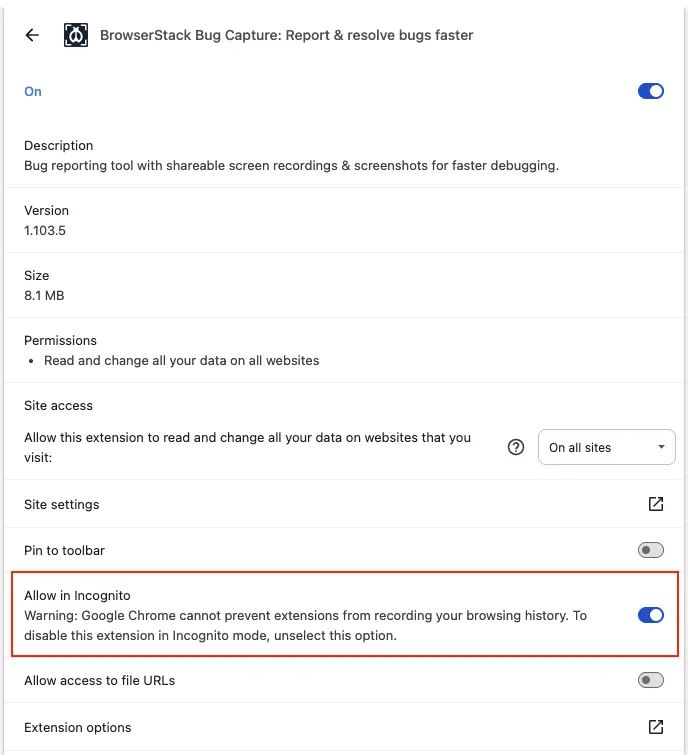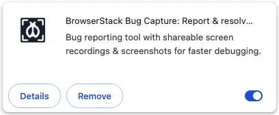 chrome://extensions/. - Click on the Details button on the Bug Capture extension.