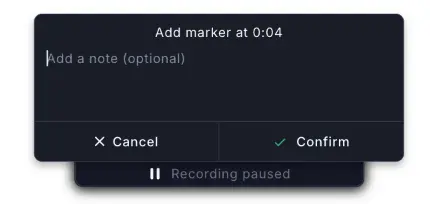 Use markers to highlight specific issues, or organize longer recordings into chapters. Click the Marker button in the recording toolbar to add one, your recording will pause to allow you to add a note to the marker and resume after you confirm.