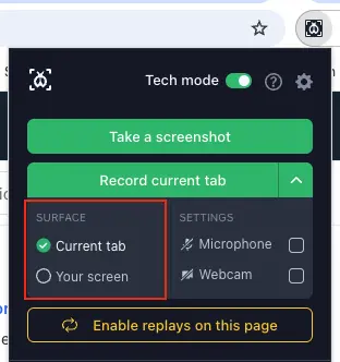 Allows you to record the entire screen or a specific window. This option is ideal when you need to record a bug that involve switching between different tabs or windows.
