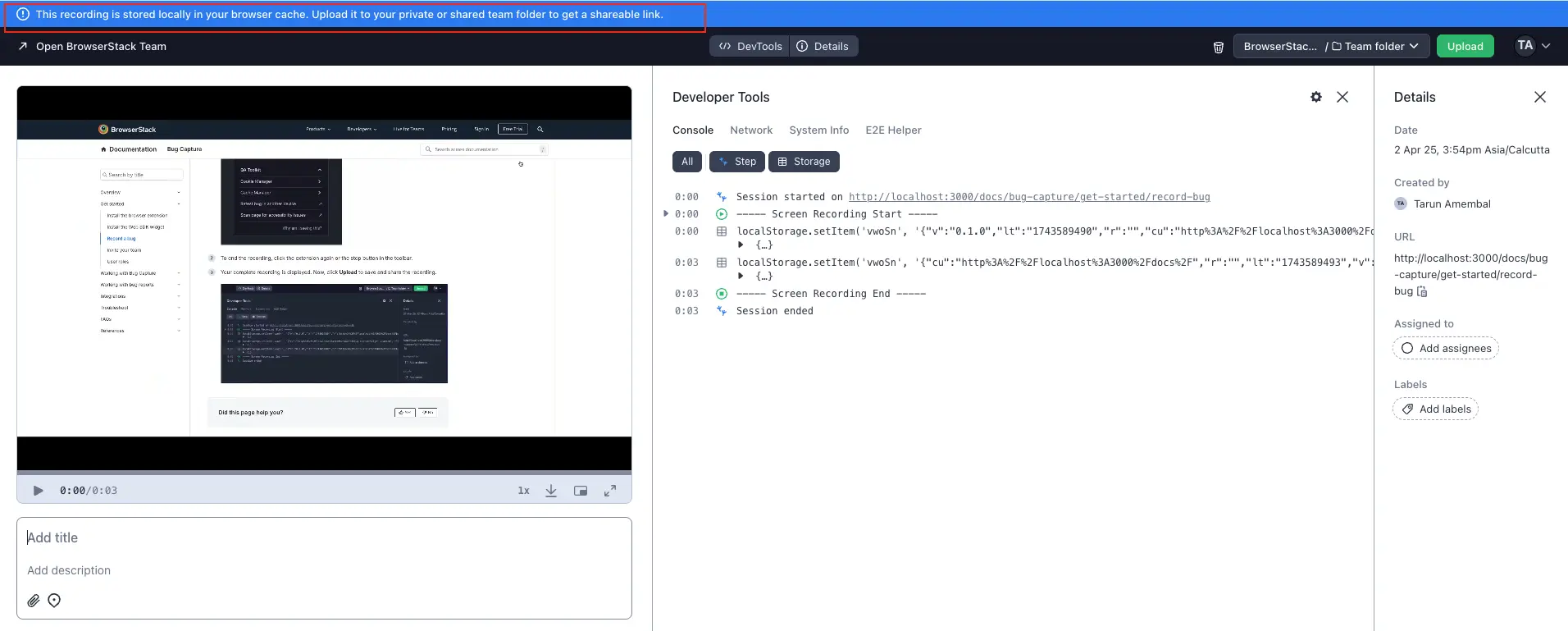 When you finish recording, a “local” version will appear for you to review, which is stored locally on your device. This is marked by the blue banner along the top.