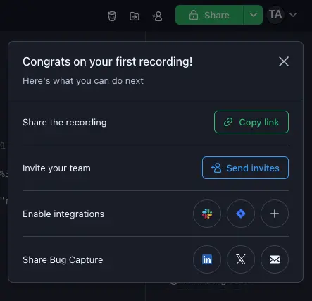 - A confirmation is displayed when the upload is complete. Also, you will see various options to share your recording and invite teams.