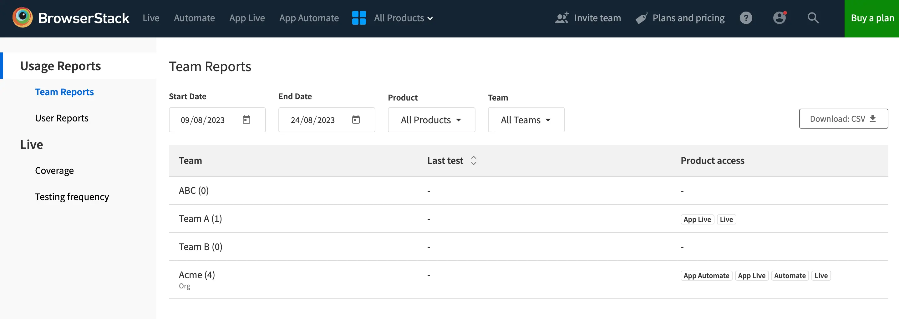 Usage Reports provide valuable insights into your BrowserStack utilization. They help you with the necessary information to make efficient decisions regarding the allocation and usage of parallel resources and user licenses among teams and individuals.