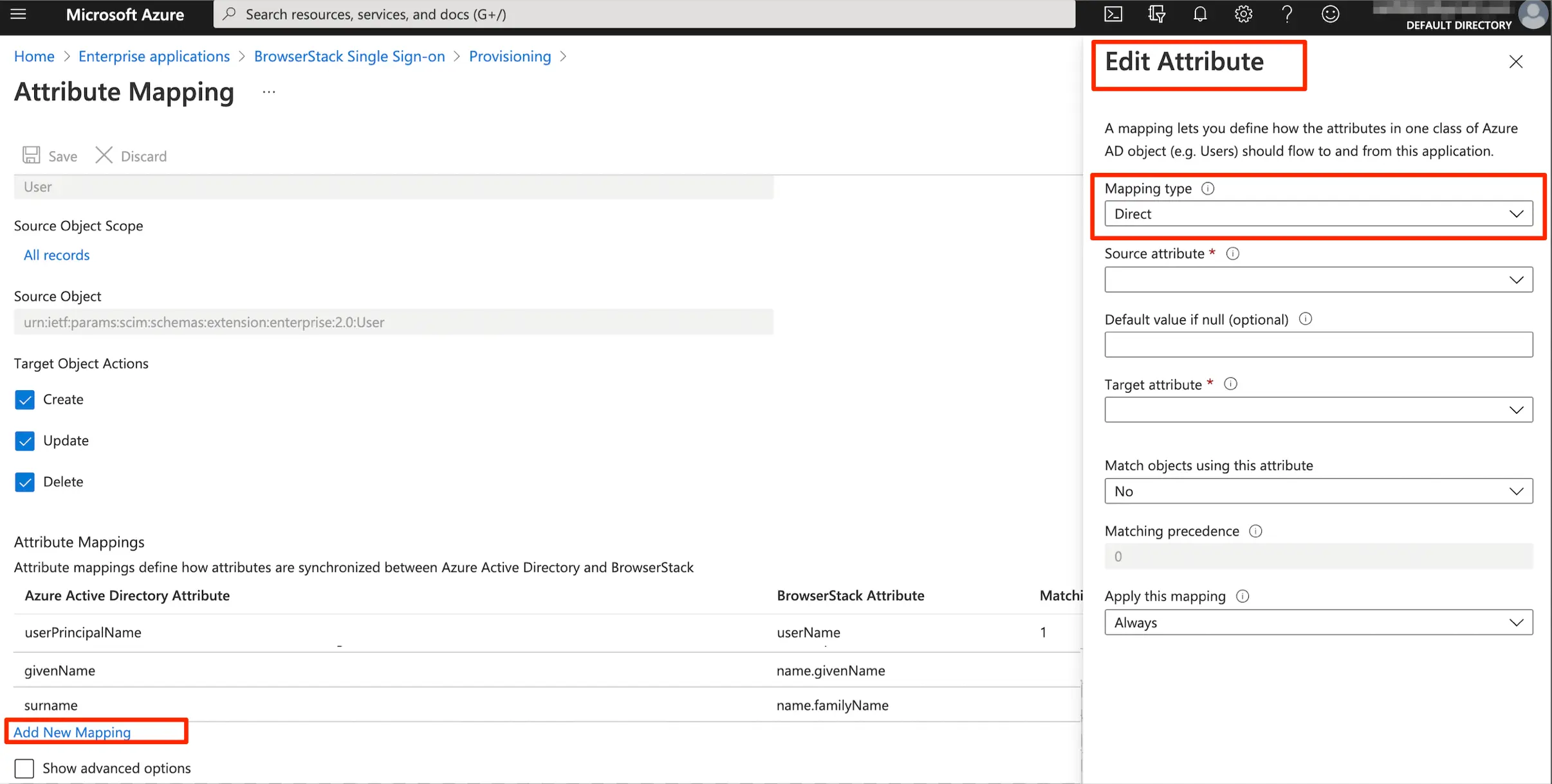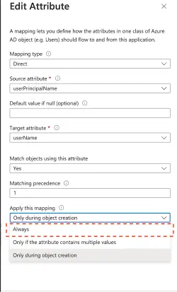 userPrincipalNamemapping, click Edit. Under Apply this mapping dropdown, you need to selectAlwaysas the value.