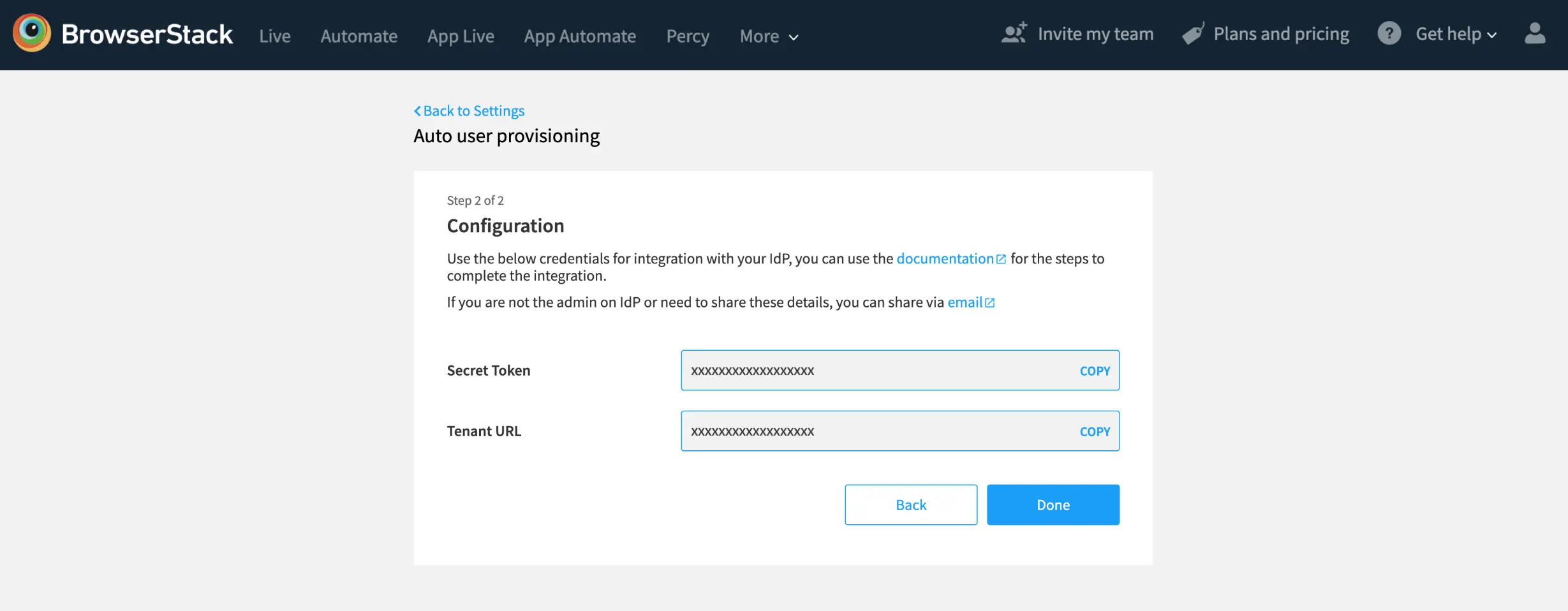 - Copy the Tenant URL and Secret Token. These values will be entered in the Tenant URL and Secret Token fields in the Provisioning tab of your BrowserStack application in the Azure portal. Click Done.