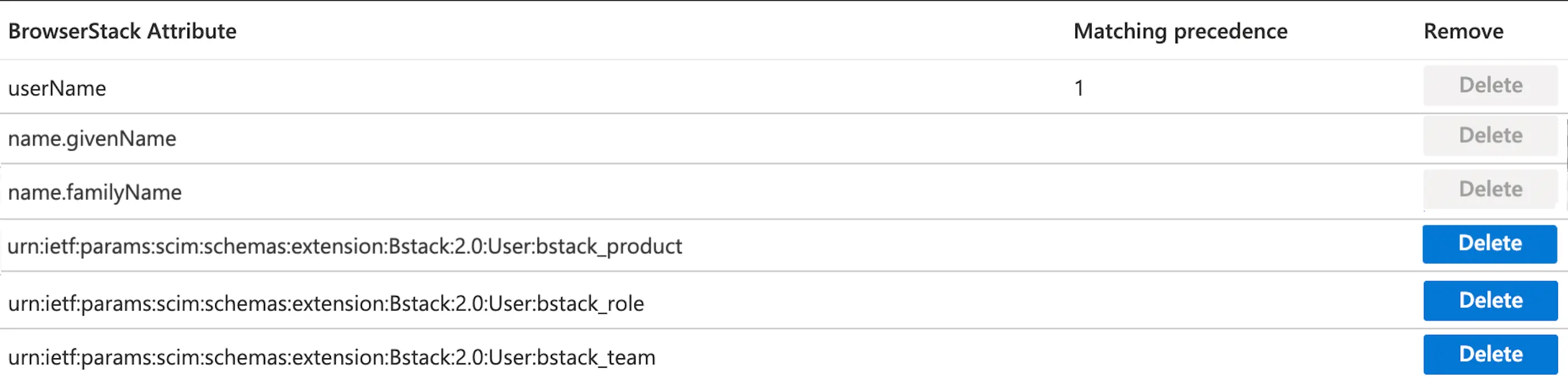 userName,name.givenName,name.familyName) for application to function correctly. For these required attributes, the Delete feature is unavailable in Azure.