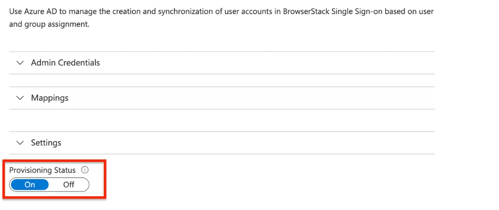 - Your provisioning configuration has been saved on BrowserStack. Enable user provisioning in BrowserStack once the provisioning setup on Azure AD is completed, to prevent blocking of inviting new users from BrowserStack Account.