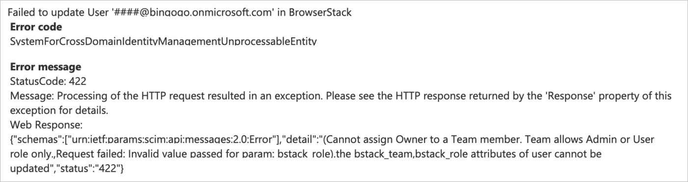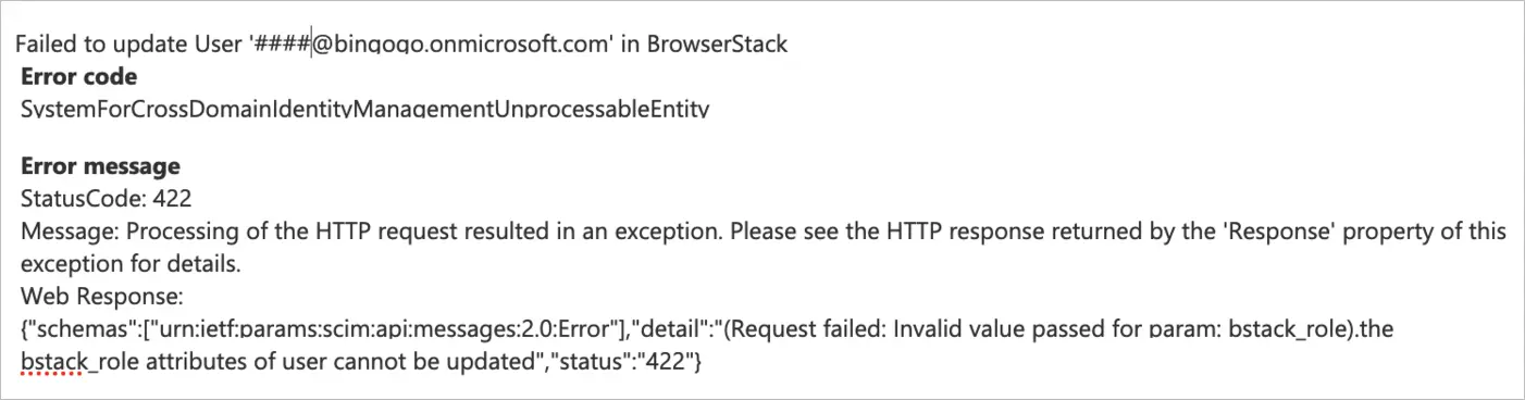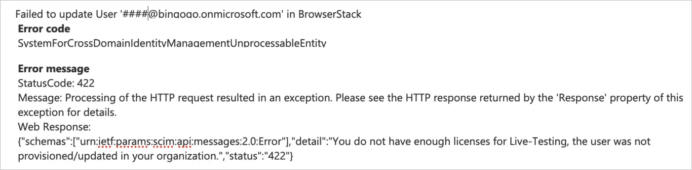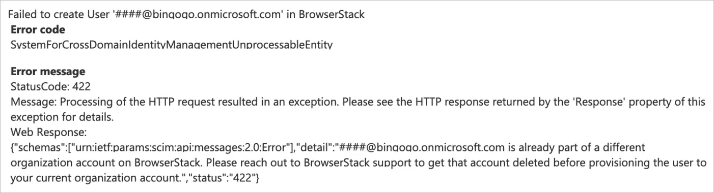 Resolution: User is already present on BrowserStack under a different organization, please reach out to BrowserStack support to get that account deleted before provisioning the user to your current organization account.