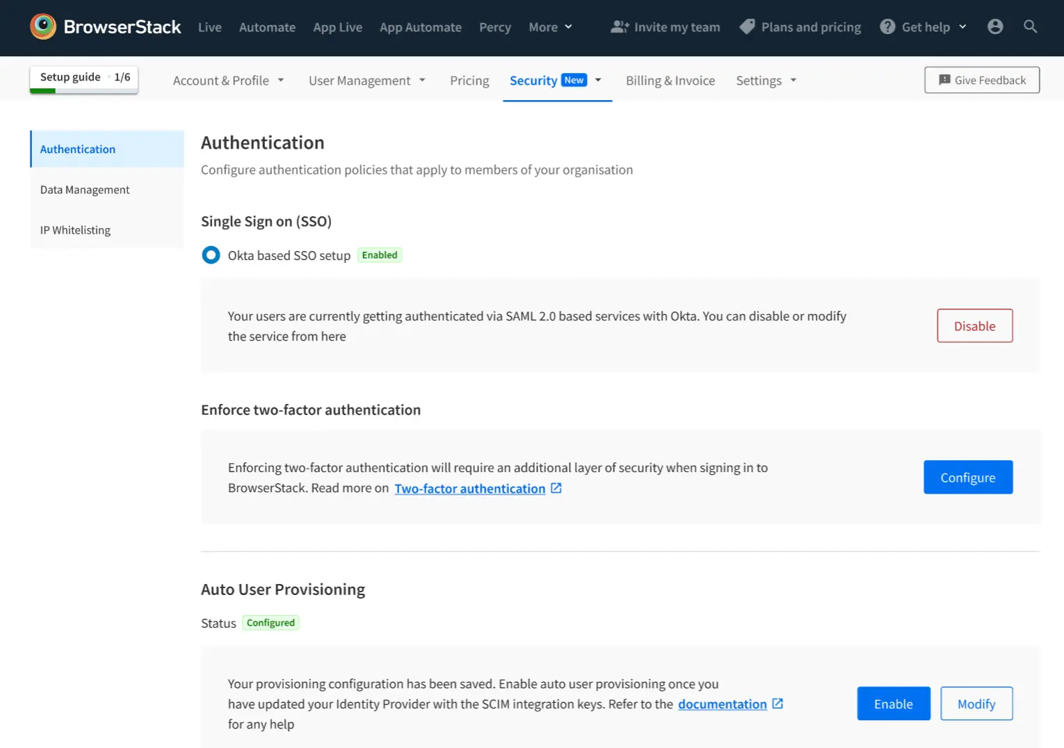 Once you have completed the above steps, go to on BrowserStack and click Enable to enable user provisioning. If you don’t enable it, you will be locked out of inviting new users via BrowserStack UI.