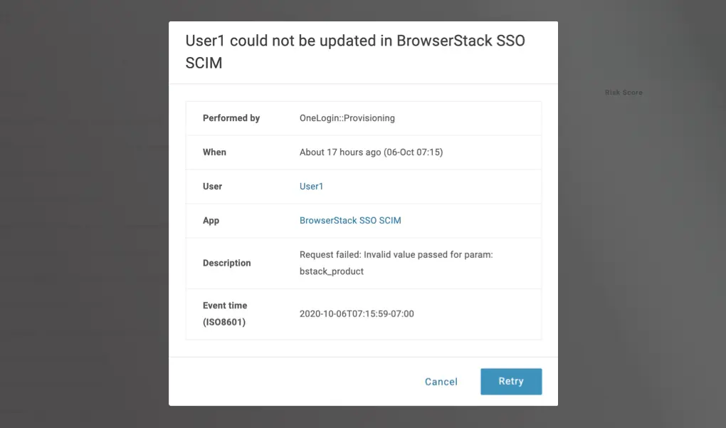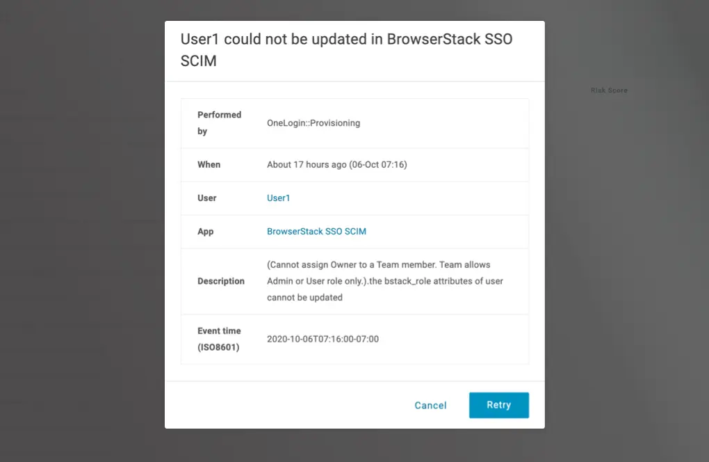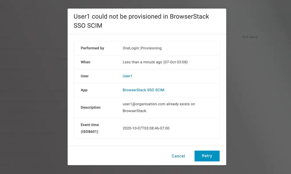 Resolution: User already presents on BrowserStack under a different organization, please get the account deleted before provisioning the user.
