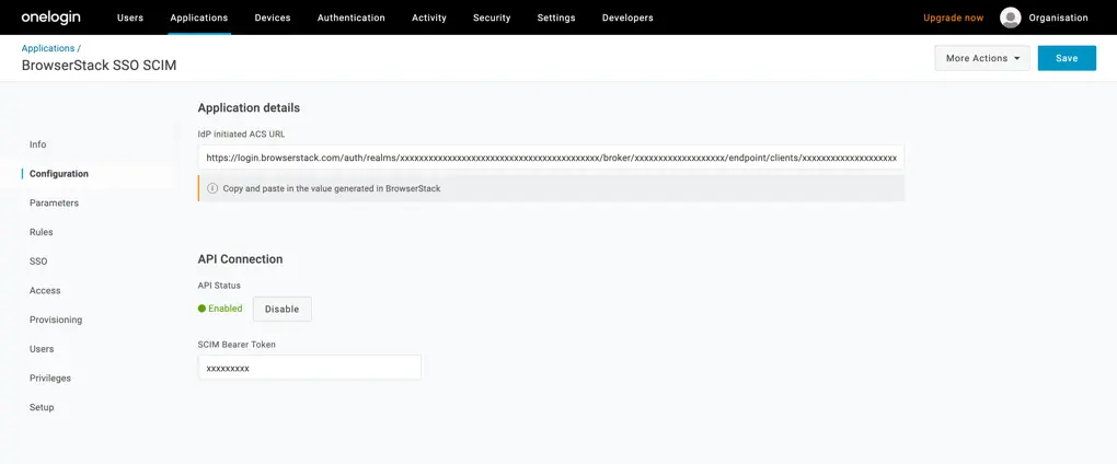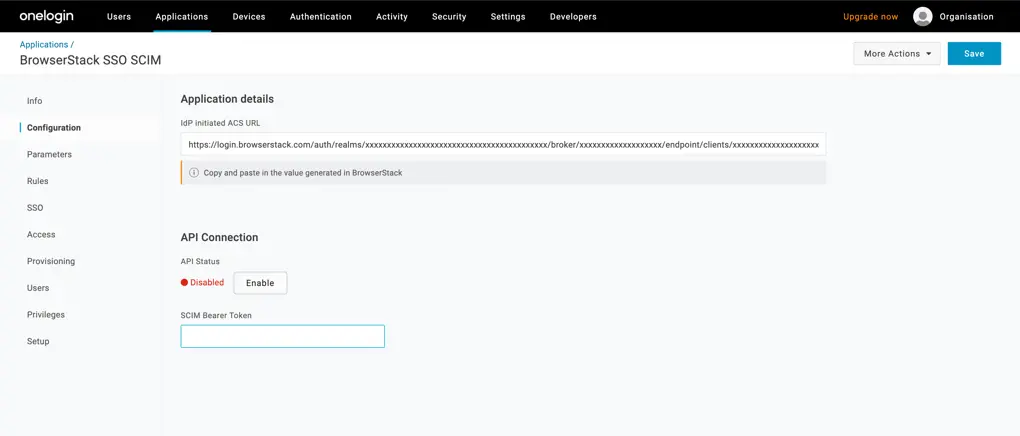 - Add the Access Key from BrowserStack in the SCIM Bearer Token field on OneLogin.