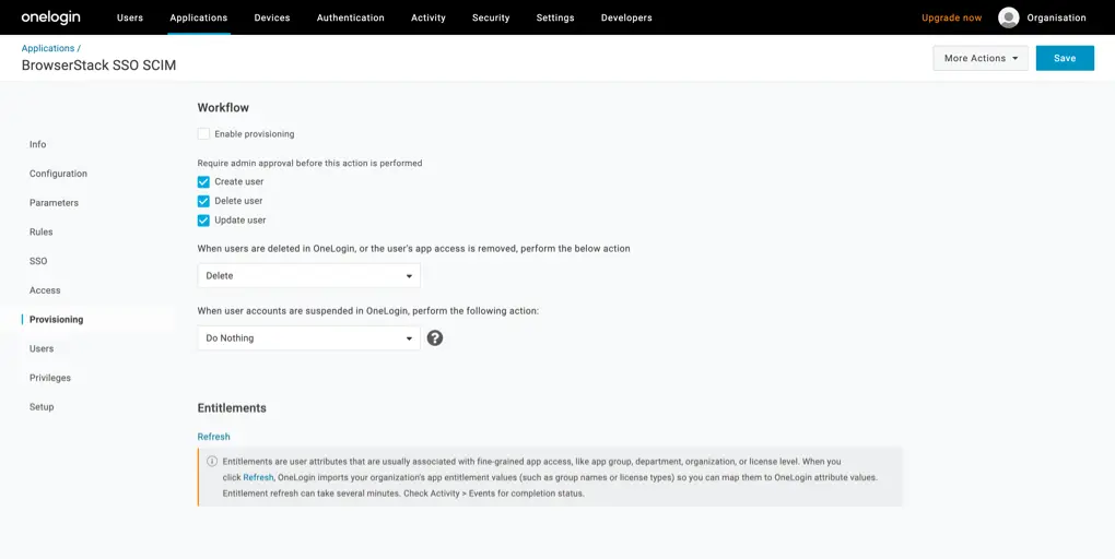 Save the current state. We will enable Provisioning on BrowserStack before coming back and enabling it on OneLogin. You can enable it via the provisioning tab at this step, but the users will not be pushed into BrowserStack till we enable it on BrowserStack.